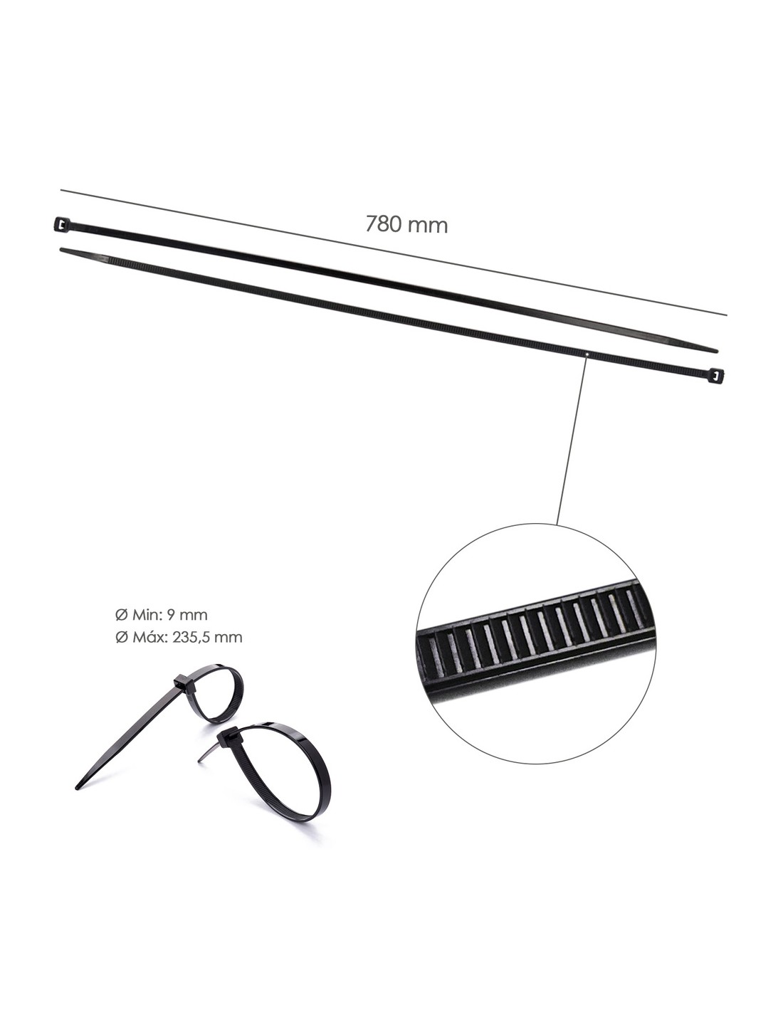 Brida Nylon 100%. Color Negro 9,0 x 780 mm. Bolsa 100 unidades. Abrazadera Plastico, Organizador Cables, Alta Resistencia