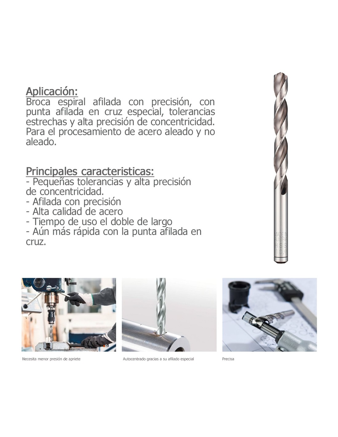 - Aplicación: Broca espiral afilada con precisión, con punta afilada en cruz especial, tolerancias estrechas y alta precisión de concentricidad. Para el procesamiento de acero aleado y no aleado.