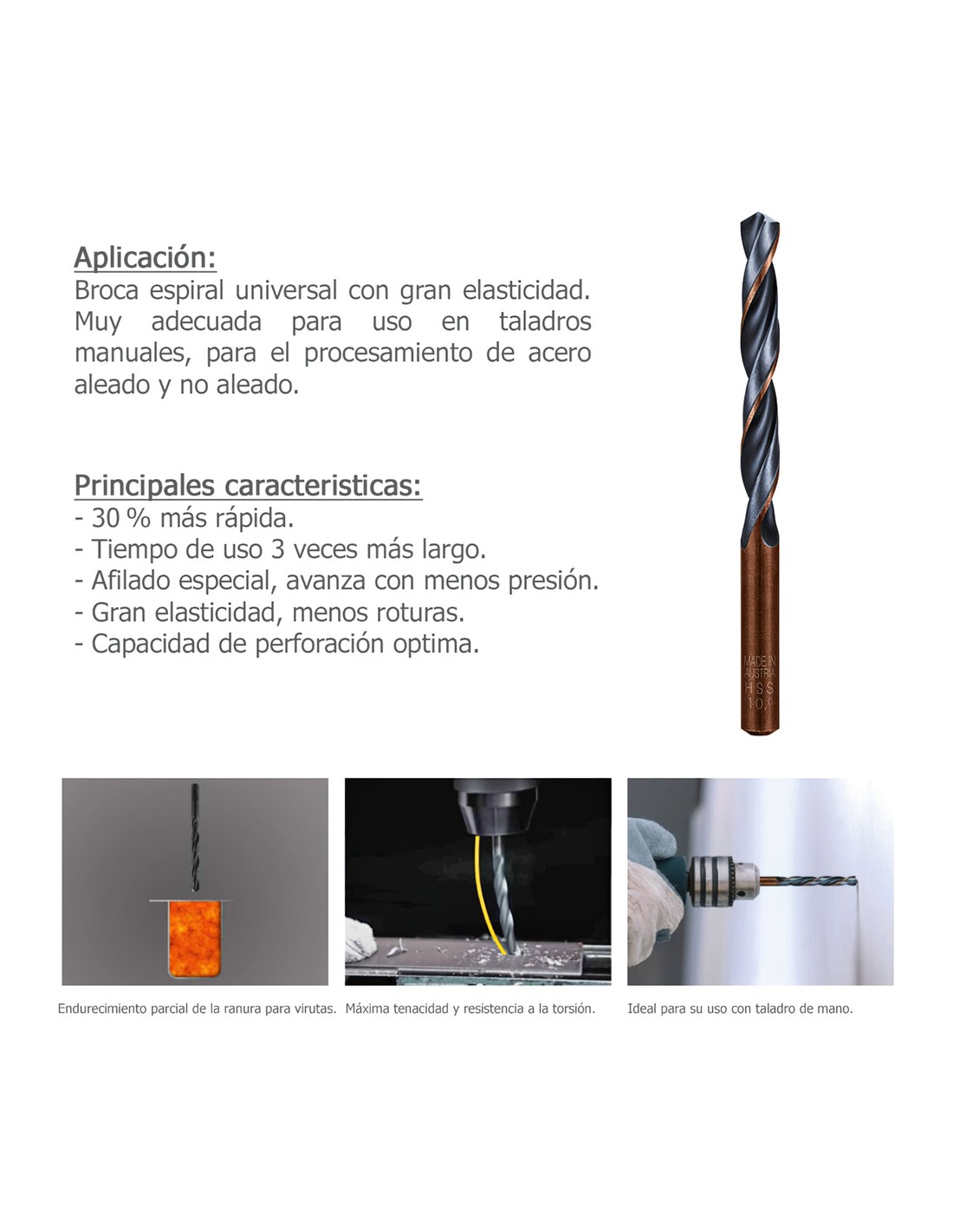 - Aplicación: Broca espiral universal con gran elasticidad. Muy adecuada para uso en taladros manuales, para el procesamiento de acero aleado y no aleado.