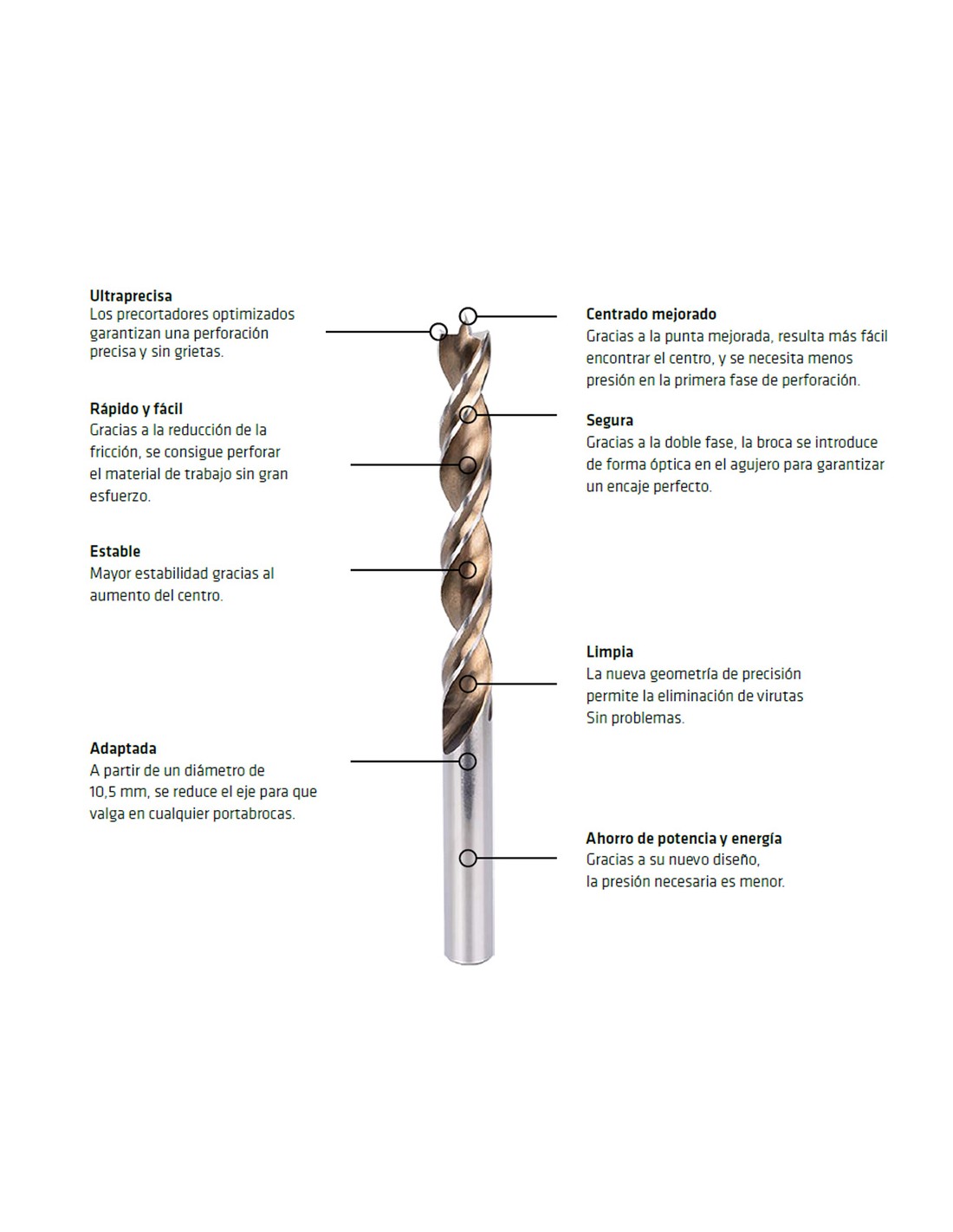 - Rápido y fácil Gracias a la reducción de la fricción, se consigue perforar el material de trabajo sin gran esfuerzo.