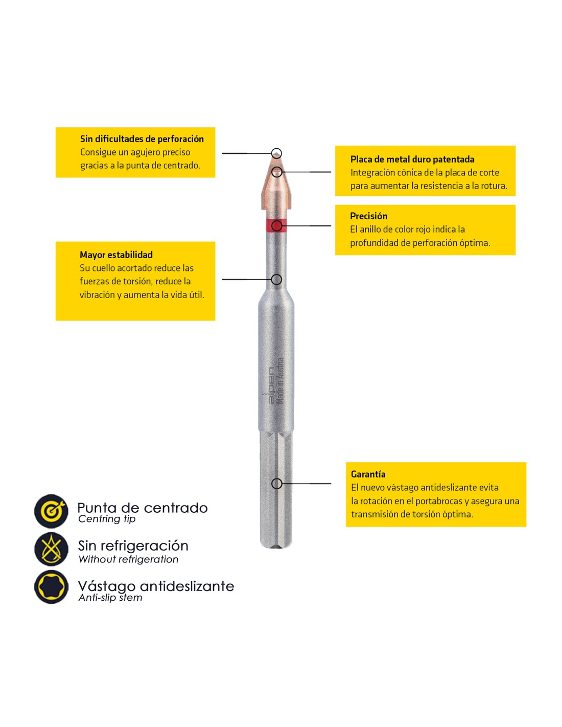 - Aplicación: Para baldosas de gres extremadamente duros con una dureza 9 de Mohs / Ritz y vidrio y porcelana. No es necesaria la refrigeración. No adecuada para el taladrado a percusión.
