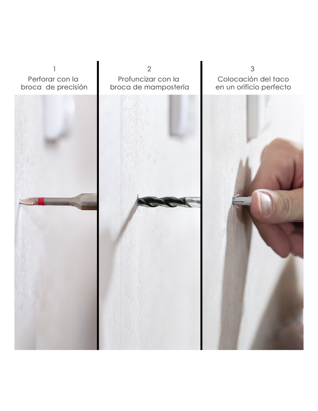 - Sin dificultades de perforación, Consigue un agujero preciso gracias a la punta de centrado.