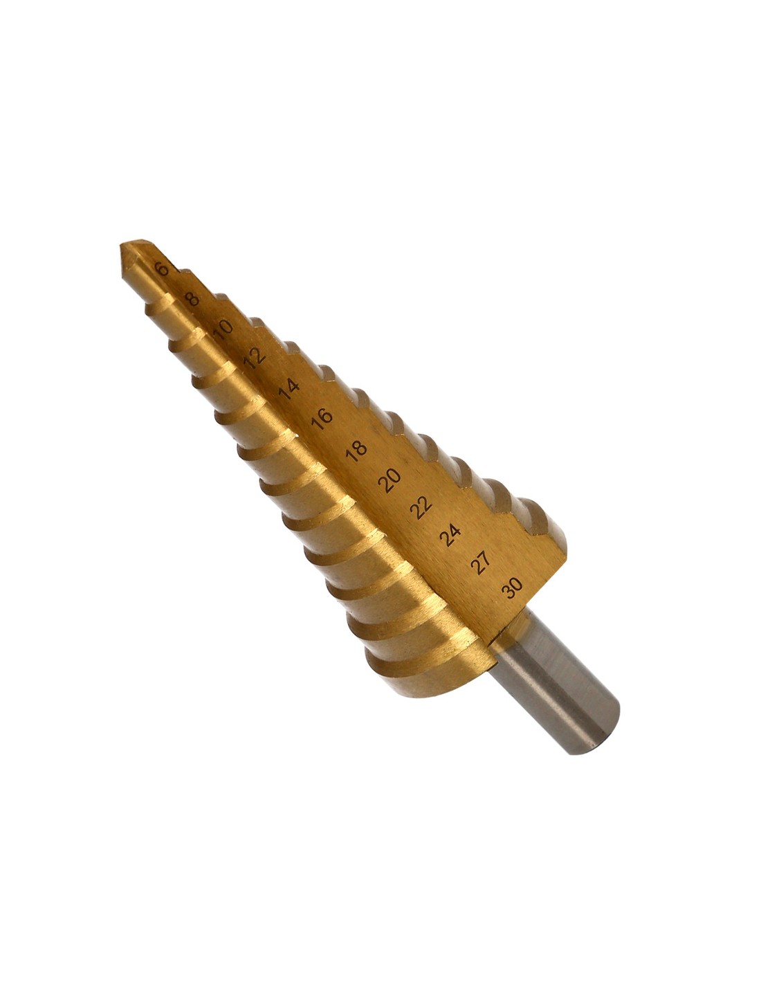 Broca hss escalonada - Medida: de 6 a 30 mm de diámetro. - Gran elasticidad. - Mucha resistencia a la fractura. - Gran rendimiento de taladrado. - Indicada para metales. - Vástago de 10 mm.