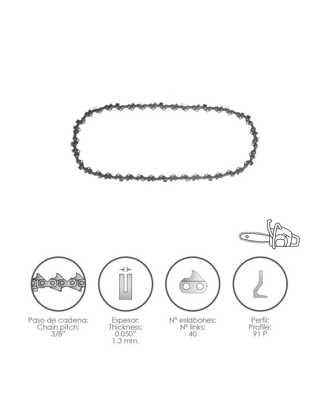 Cadena Motosierra 3/8" / 0.050" 1,3 mm. / 40 Eslabones / 91 P