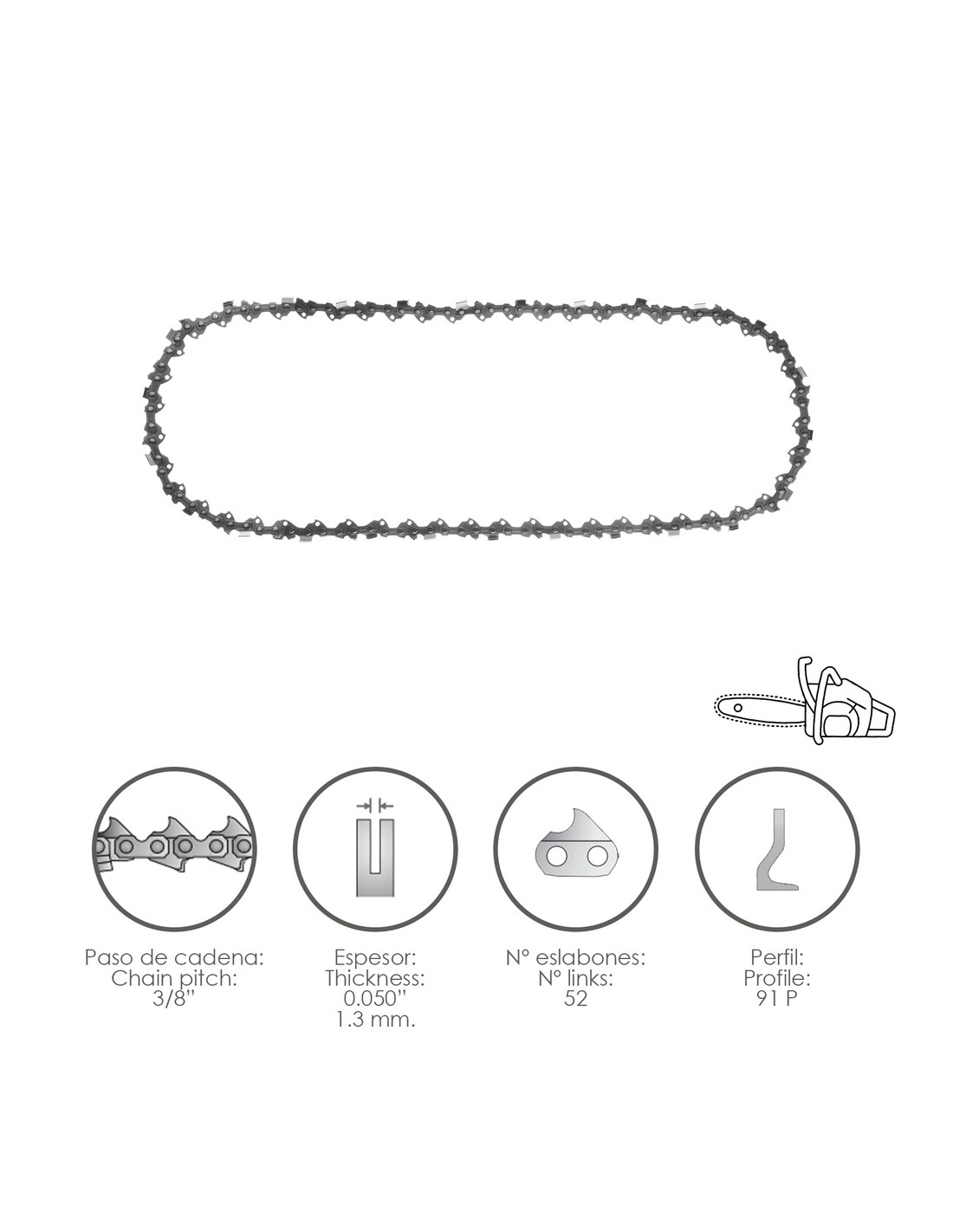 Cadena Motosierra 3/8" / 0.050" 1,3 mm. / 52 Eslabones / 91 P