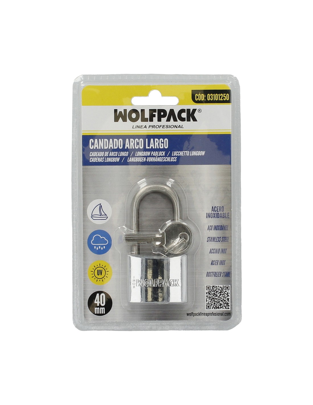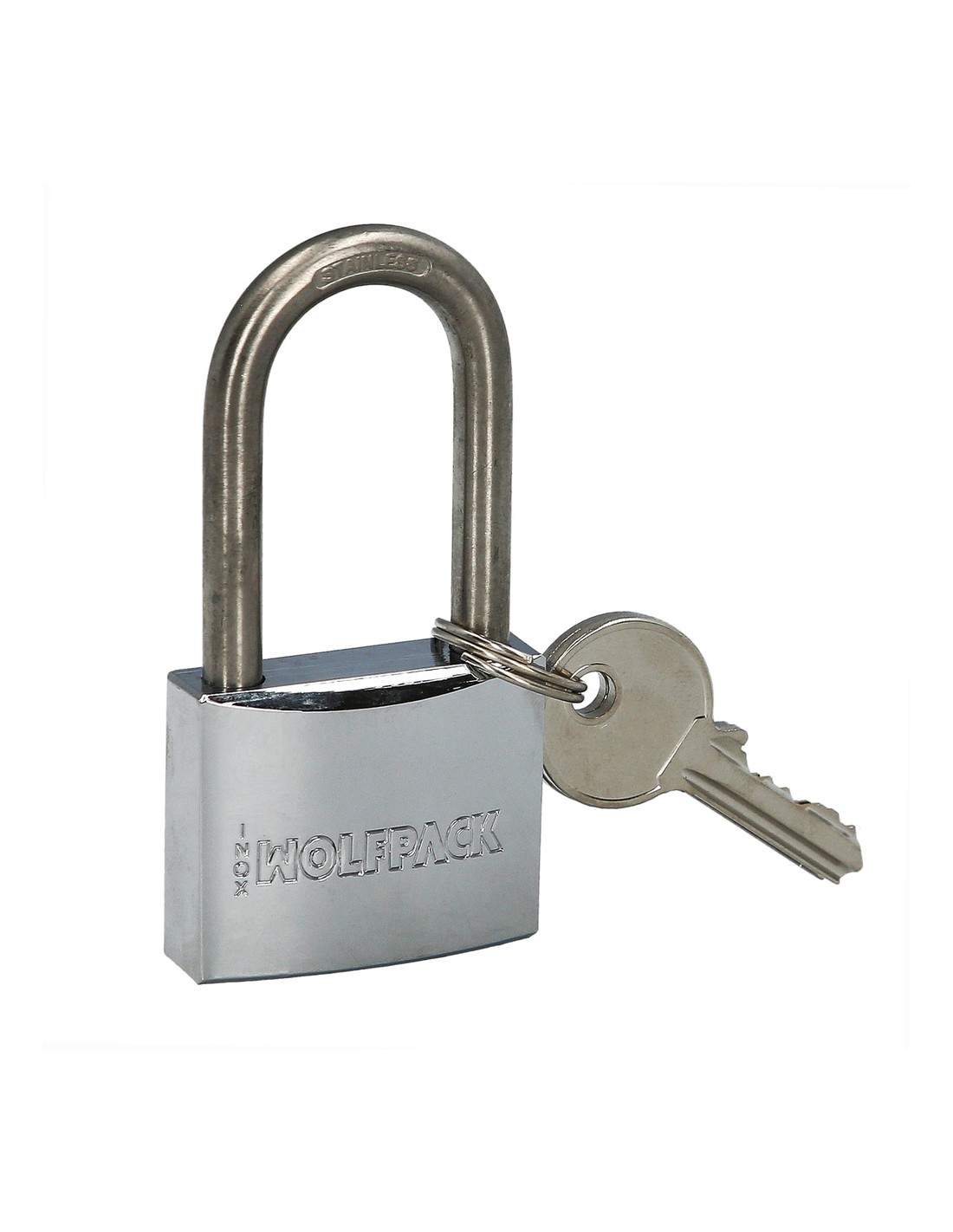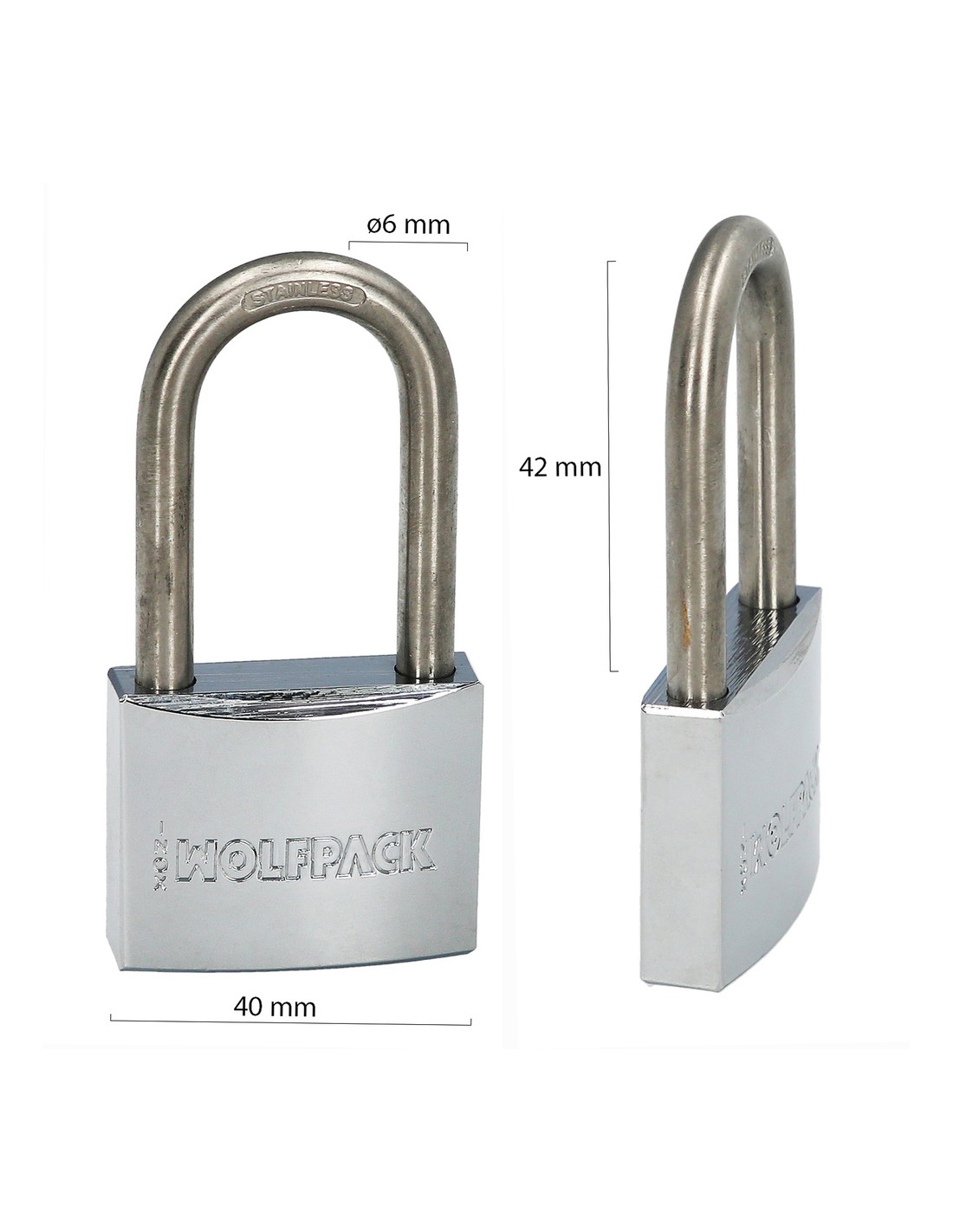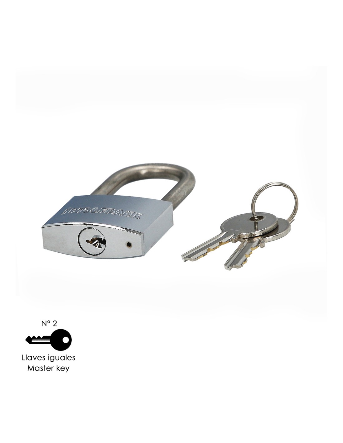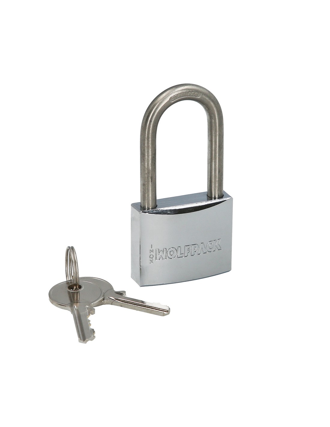 Candado inoxidable. - Arco largo. - Medida: 40 mm. - Realizado en acero inoxidable. - Doble cierre. - Incluye 2 llaves. - La llave se puede copiar con la IS-1D