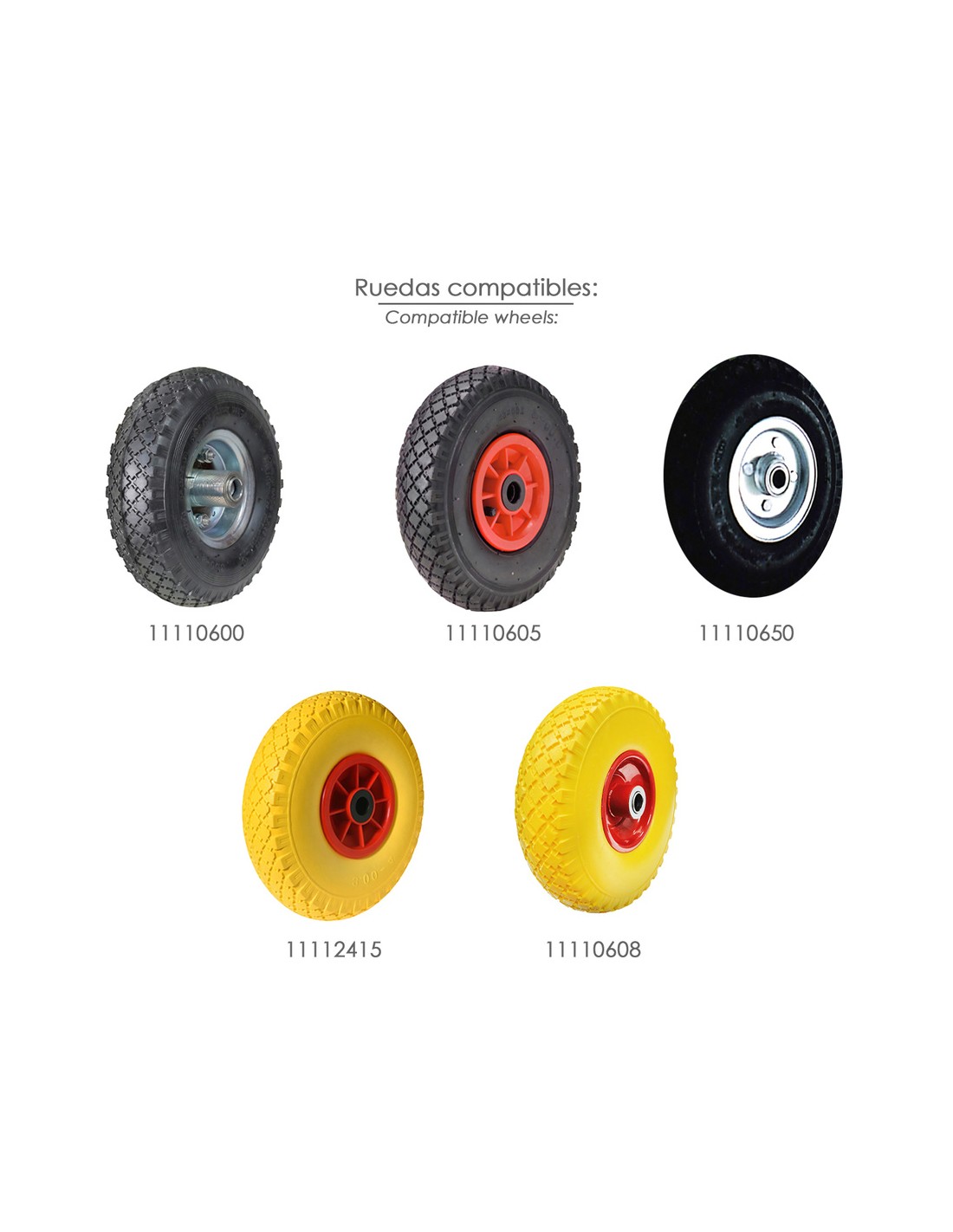 - Contiene dos ruedas neumáticas de Ø 260 x 85 mm. (10") con válvula Schrader.