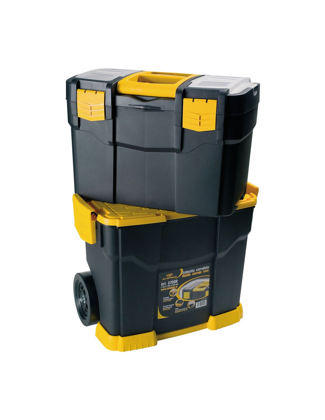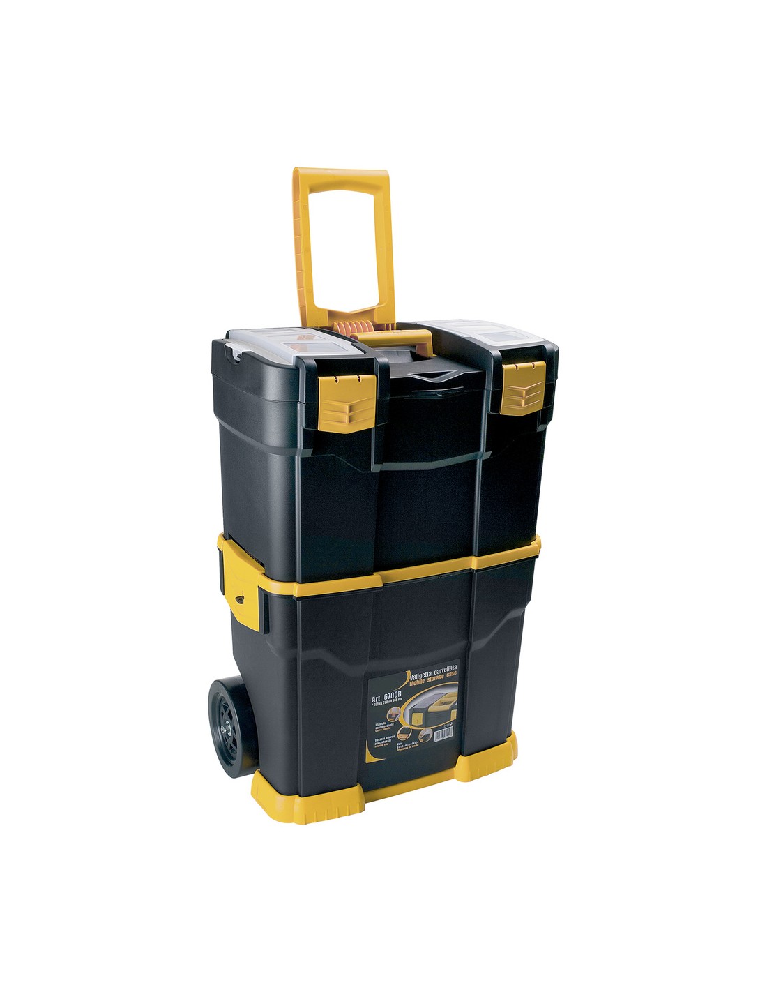 - El maletín tiene dos partes complementarias e independientes: La parte superior es un maletín de herramientas y la parte inferior es muy espaciosa y se convierte en una nueva caja al desengancharla.