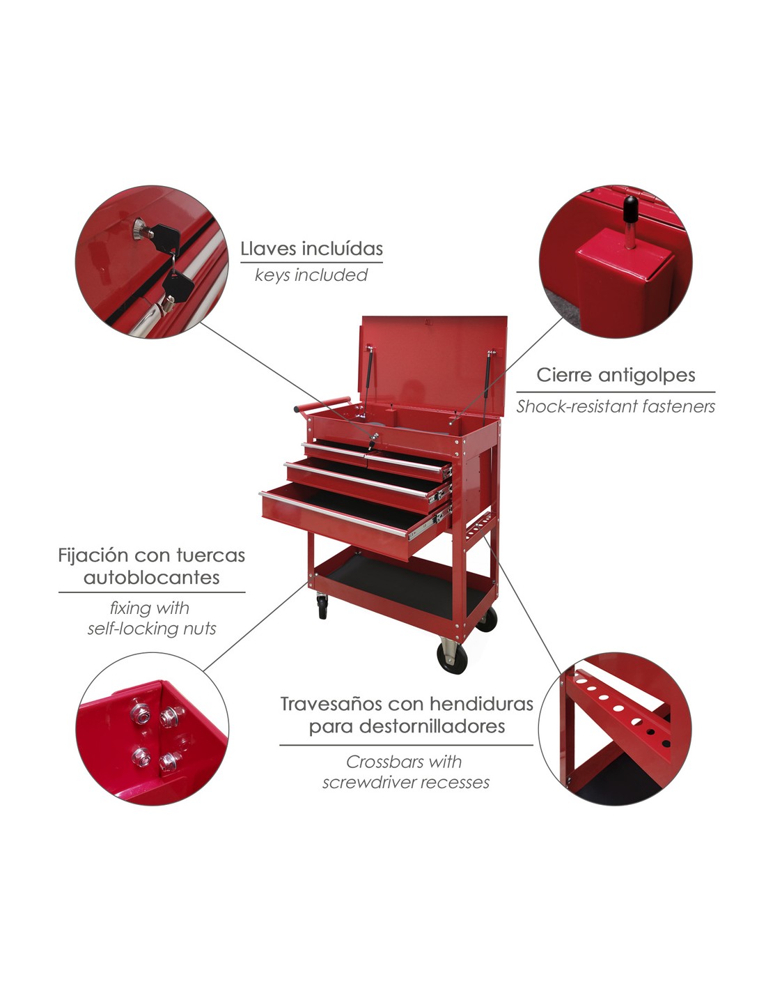 - Con este carro de harramientas puede tener todas las herramientas ordenadas de forma sencilla, gran capacidad de almacenamiento al contar con 4 cajones y 2 bandejas (una inferior y una superior con cierre)
