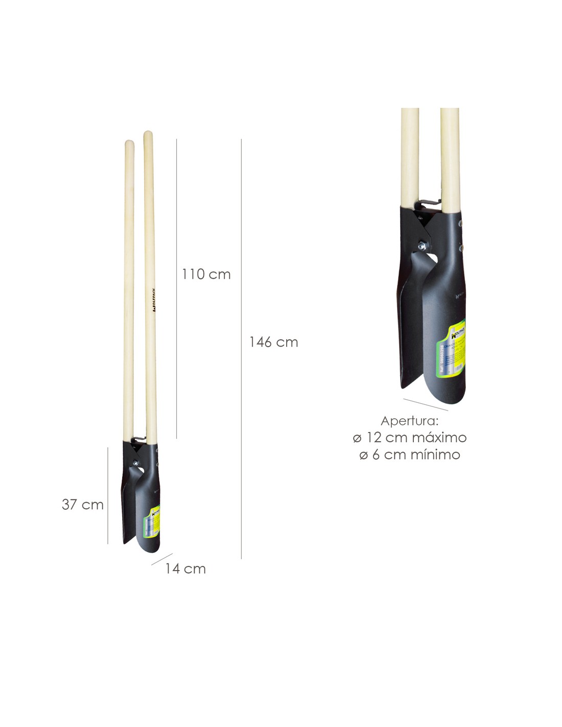 - Medidas: 146 cm. de altura total. Mango: de 114 cm. Pala: 37 cm. x 14 cm. Diámetro del agujero: Máximo Ø 12 cm. Mínimo: Ø 6 cm.