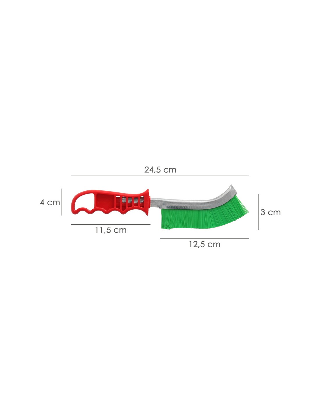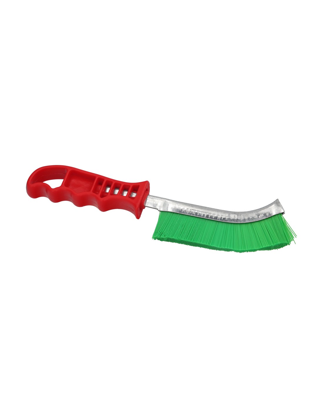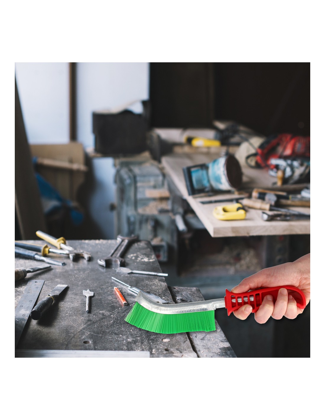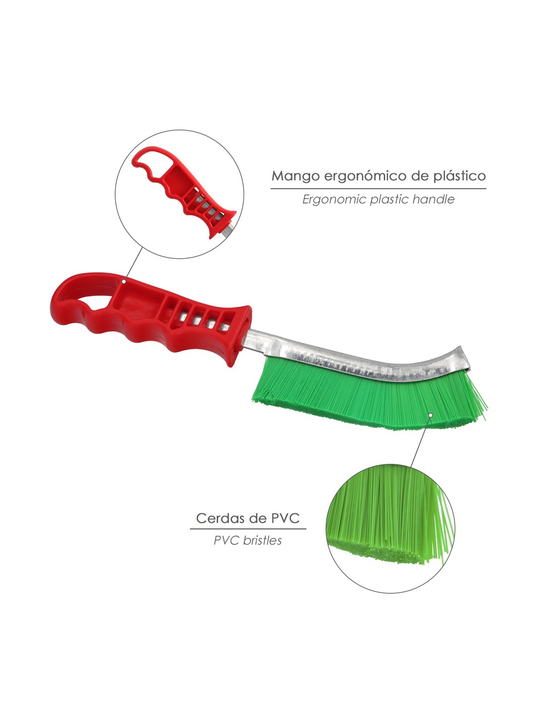 - Con púas de PVC especialmente diseñadas para pulir superficies delicadas como cristal, madera o aluminio sin arañarlas, este cepillo manual es la solución ideal para eliminar herrumbre, pintura y suciedad de manera eficiente y segura.