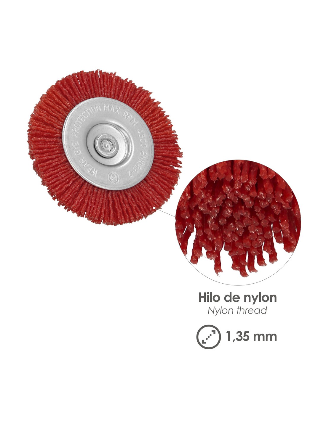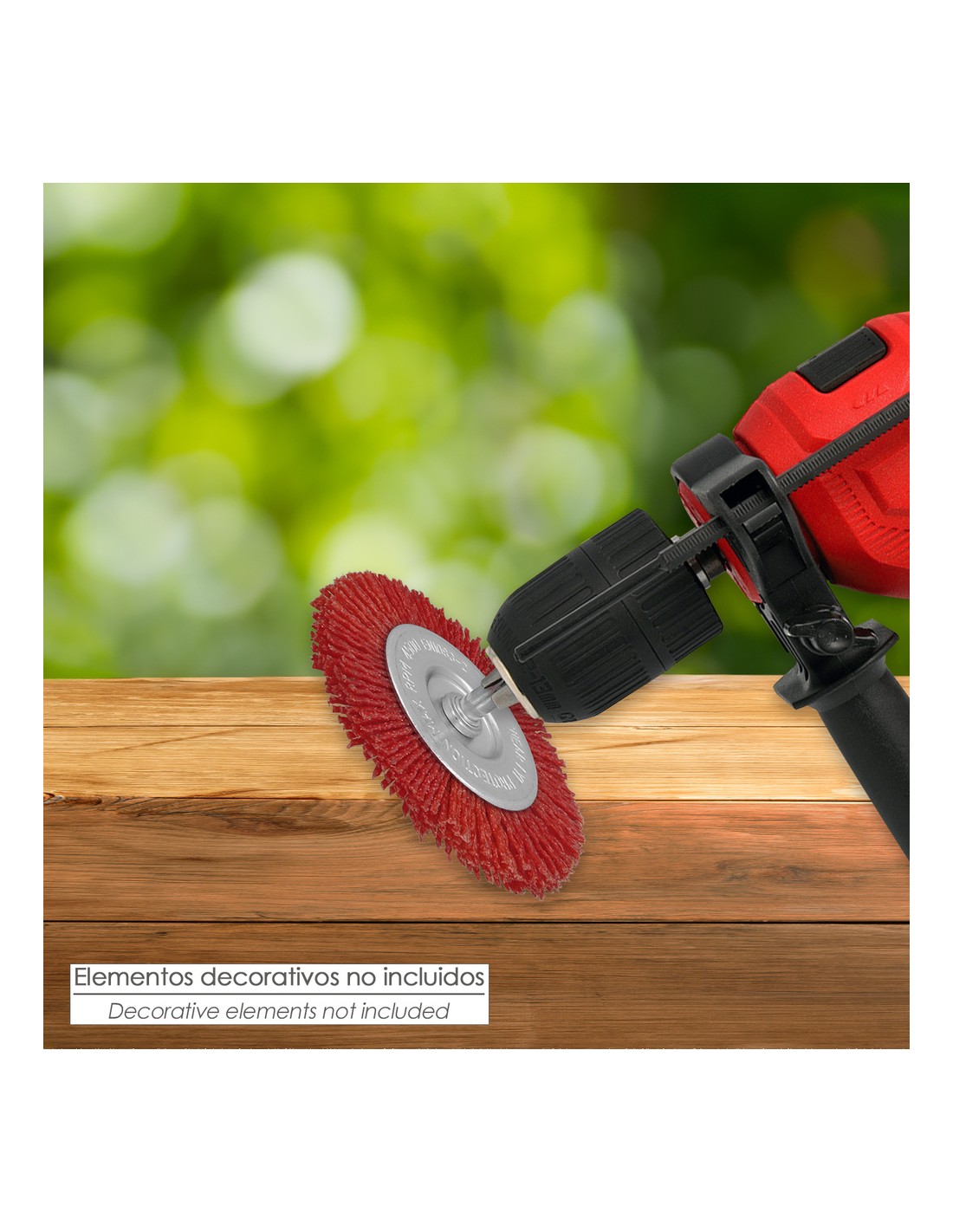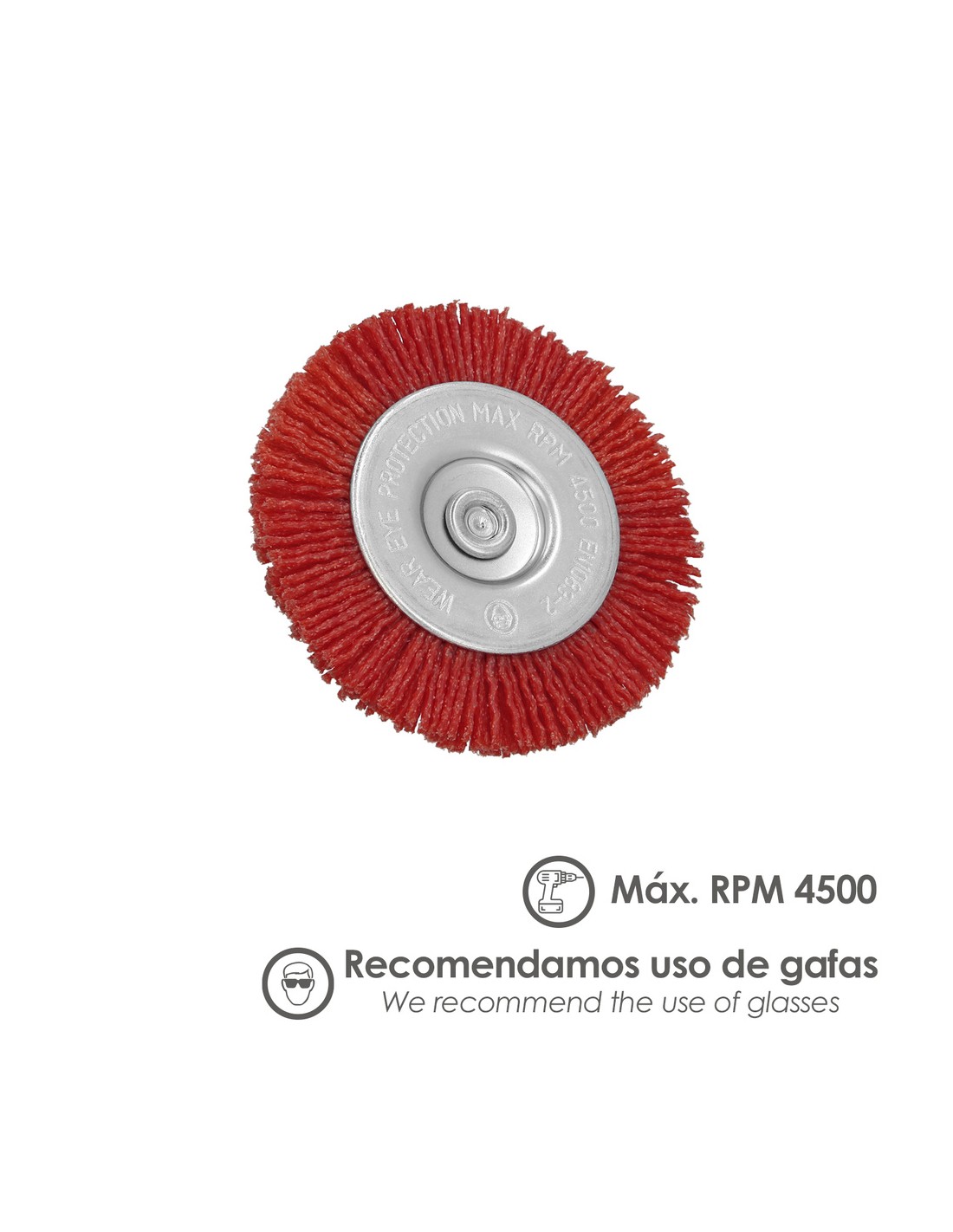 - Artículo también conocido como cepillo de lijado nailon, cepillo para taladro de nailon, cepillo de alambre abrasivo de nylon, cepillo para eliminación de óxido, cepillo para lijado de madera y metal, etc.