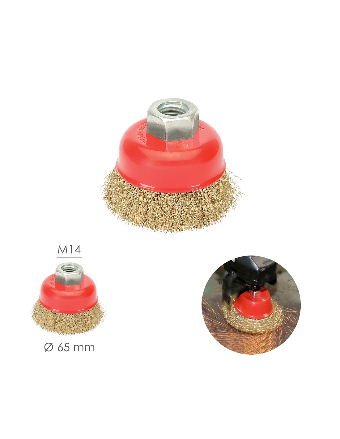 Cepillo Taza Con Alambre De Acero Latonado Rosca M14, Ø 65 mm. Alambre de Ø 0,30 mm.