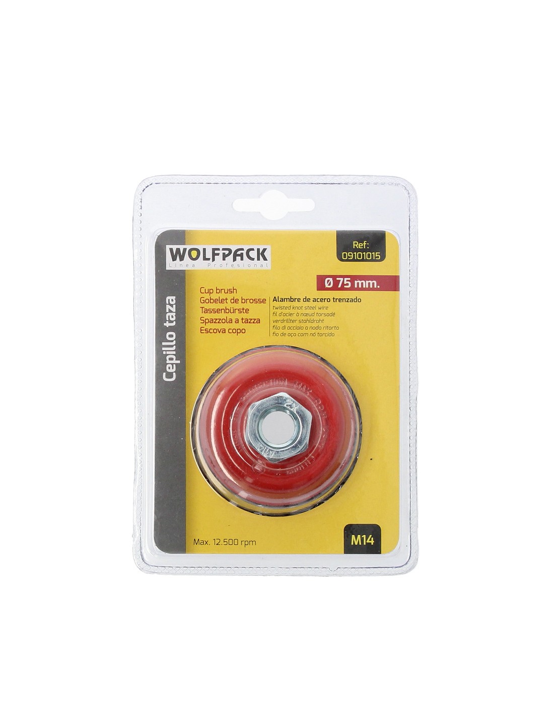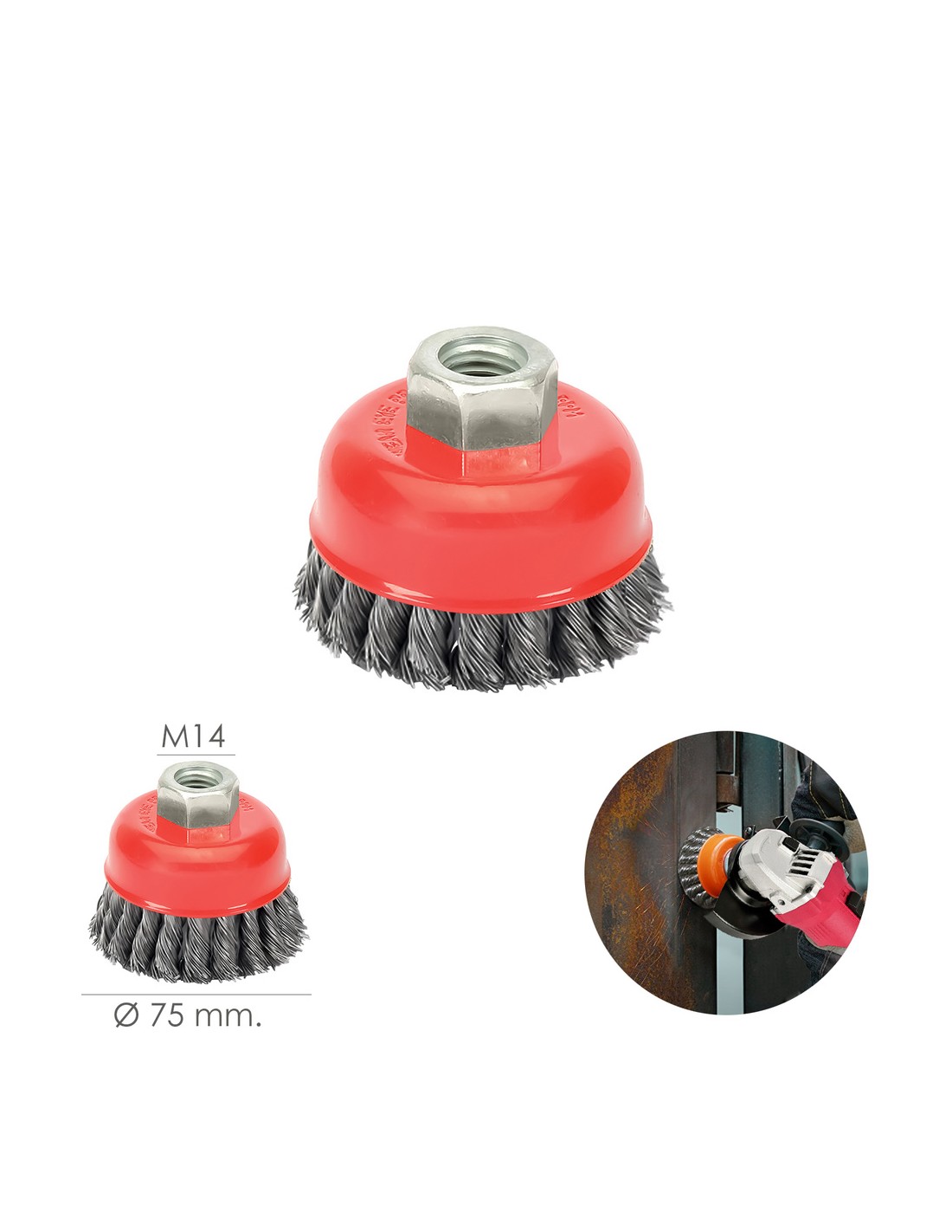 Cepillo Taza Con Alambre De Acero Trenzado Rosca M14, Ø 75 mm. Alambre de Ø 0,50 mm.