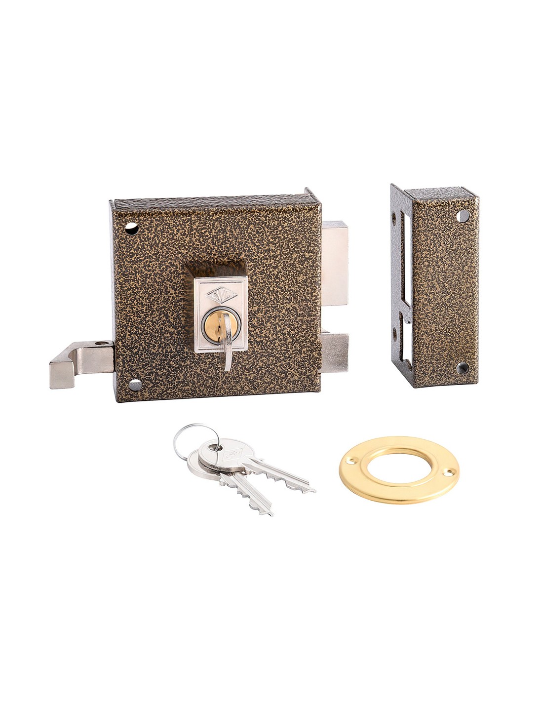 Cerradura Cvl1125a/ 8/he derecha. - Cerradura de sobreponer. - Picaporte accionado por llave exteriormente y con llave y tirador desde el interior. - Palanca de dos vueltas de llave accionable por ambos lados - Cilindro redondo. - Acabado hierro esmaltado