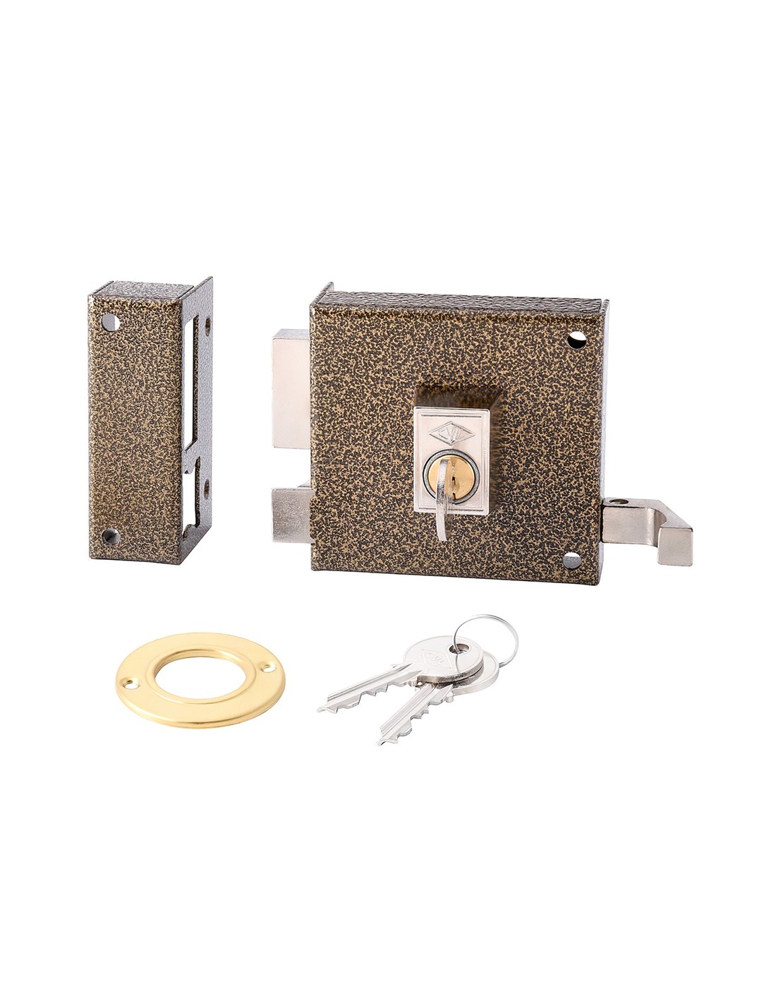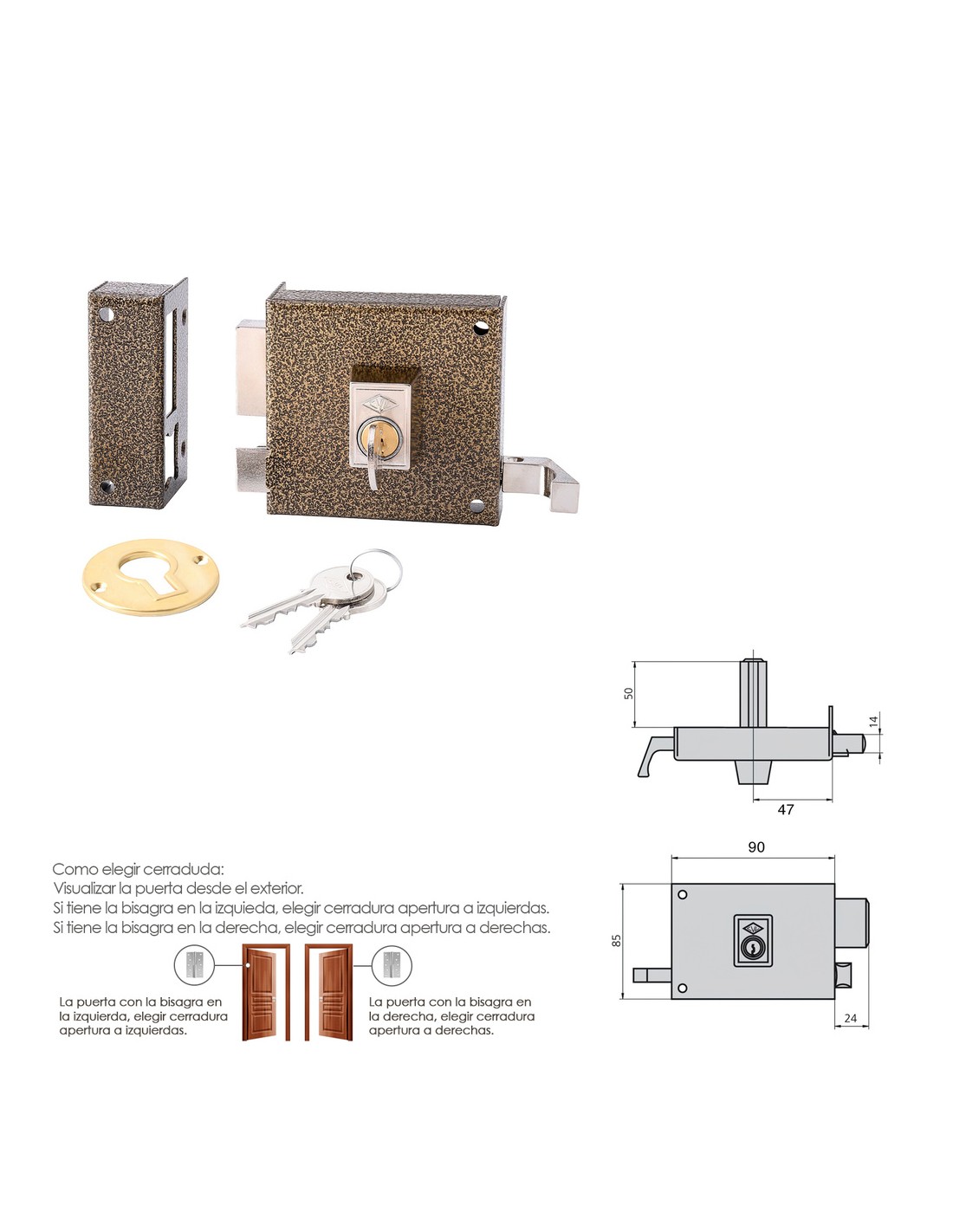Cerradura Cvl1125a/ 8/he izquierda. - Cerradura de sobreponer. - Picaporte accionado por llave exteriormente y con llave y tirador desde el interior. - Palanca de dos vueltas de llave accionable por ambos lados - Cilindro redondo. - Acabado hierro esmaltado