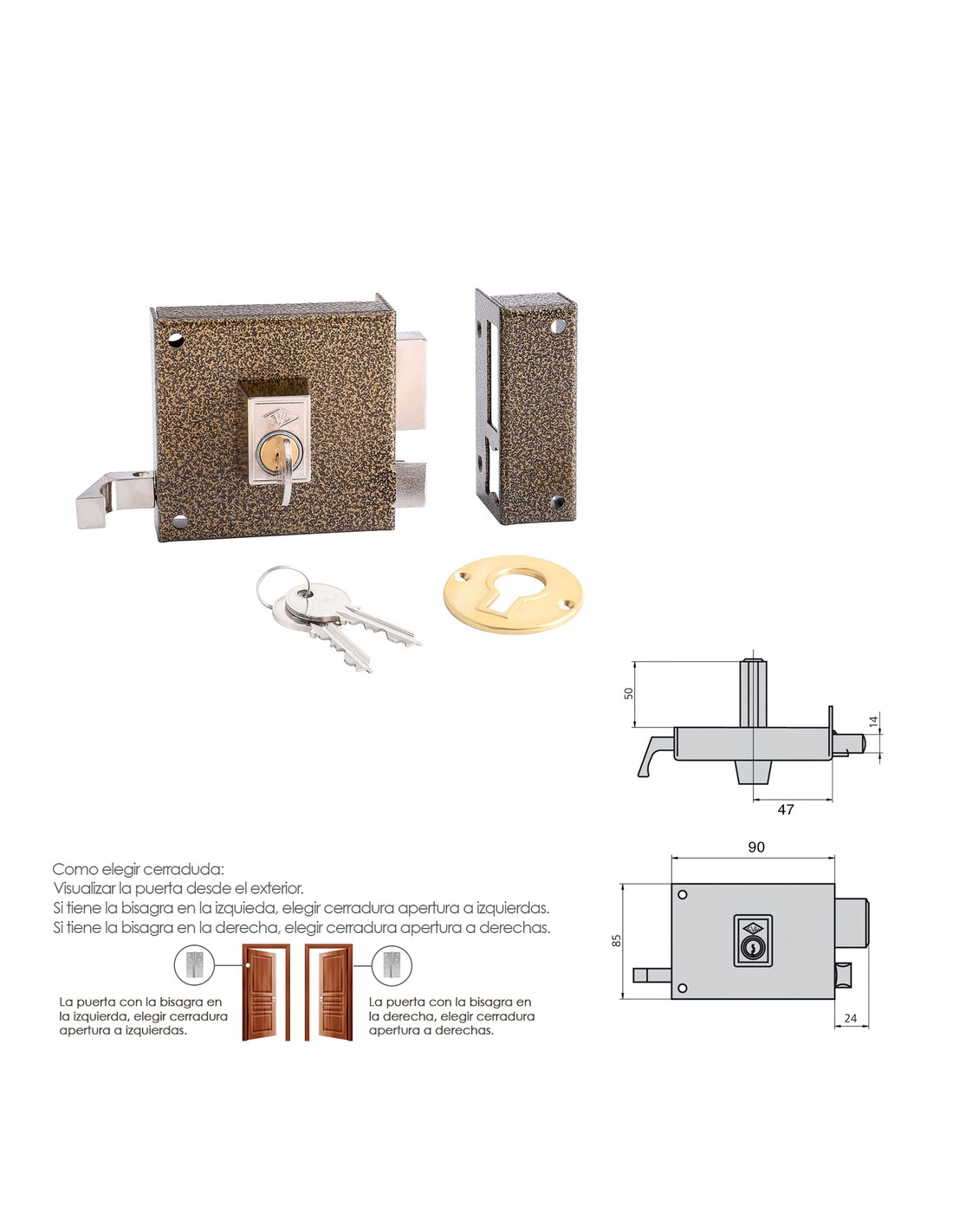 Cerradura Cvl 125a/ 8/he derecha. - Cerradura de sobreponer. - Picaporte accionado por llave exteriormente y con llave y tirador desde el interior. - Palanca de dos vueltas de llave accionable por ambos lados - Acabado hierro esmaltado - Cilindro perfil.