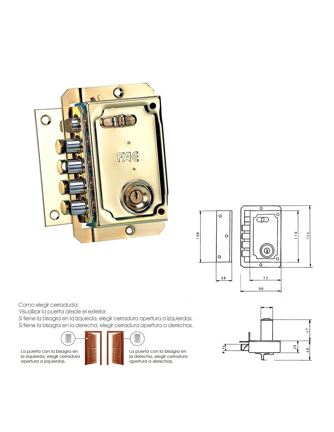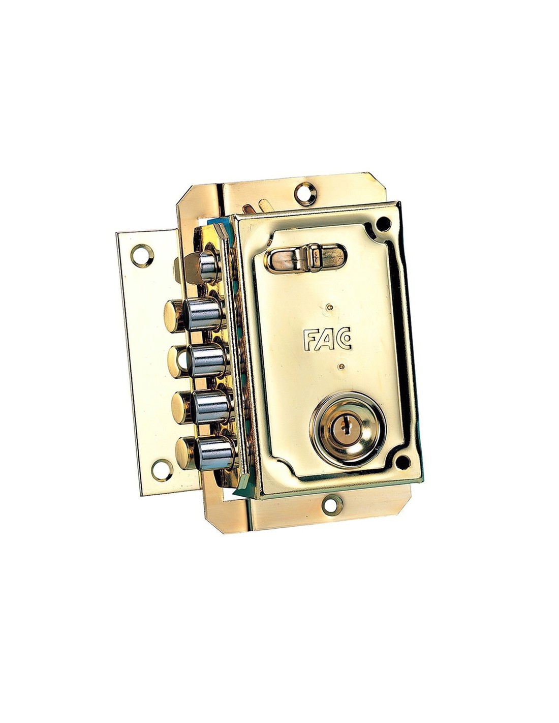 Cerradura fac s-90 dorada izquierda. - Cerradura de un punto de cierre con llave dentada. - Acabado pintado y dorado. - Sistema anti-palanqueta. - Picaporte y 4 pasadores de acero de ø 14 mm. - Palanca bloqueo picaporte. - Cilindro de latón de 50 mm. Y ø 27 mm.