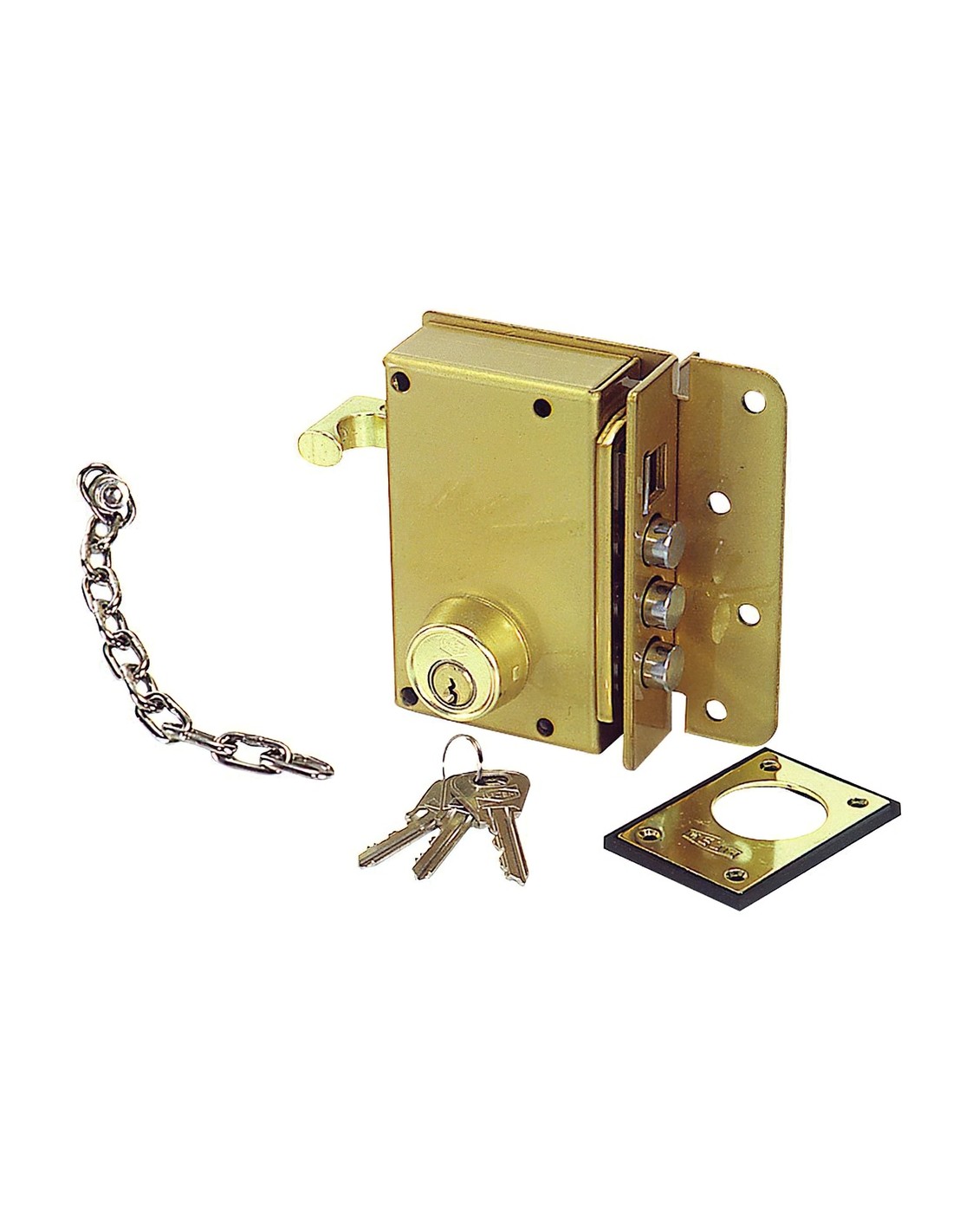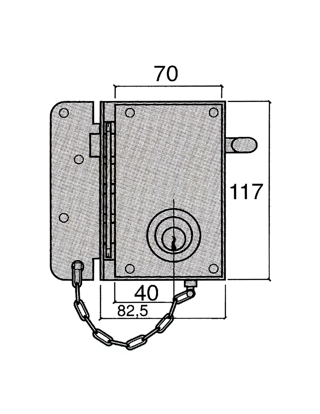 Cerradura Ucem 4500-hb/izquierda. - Sentido de apertura: izquierda. - Cerradura de sobreponer. - Acabado hierro esmaltado. - Equipada con pestillo de bulones y picaporte, cadena de seguridad, cilindro 400 sn, cerradura antipalanca y escudo 4001.