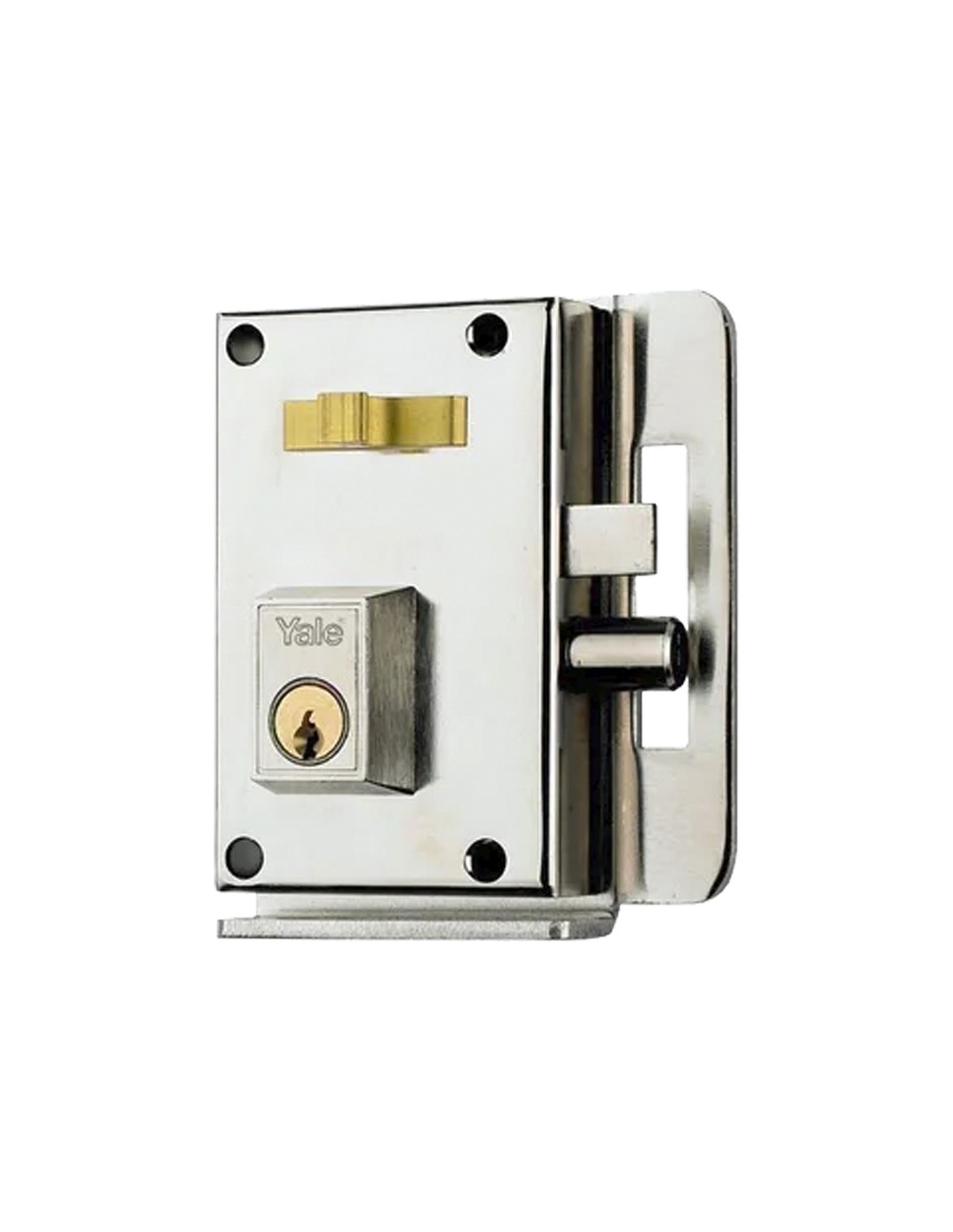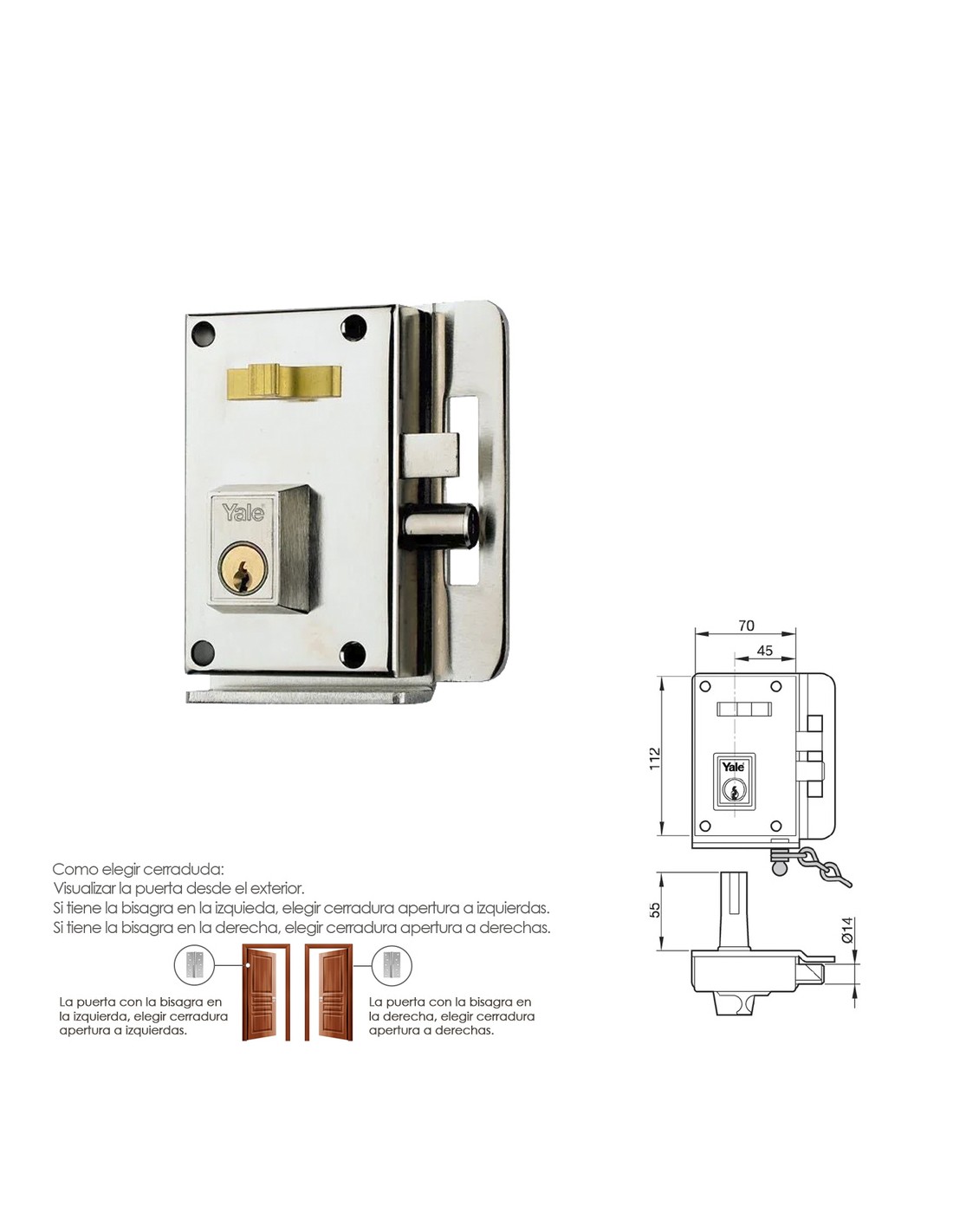 Cerradura Yale / Azbe 10-c-hn/ Derecha. - Cerraduras de sobreponer con sistema antipalanca. - Doble cilindro. - Picaporte con tirador y palanca. - Cadena retenedora. - Sentido de apertura: derecha.