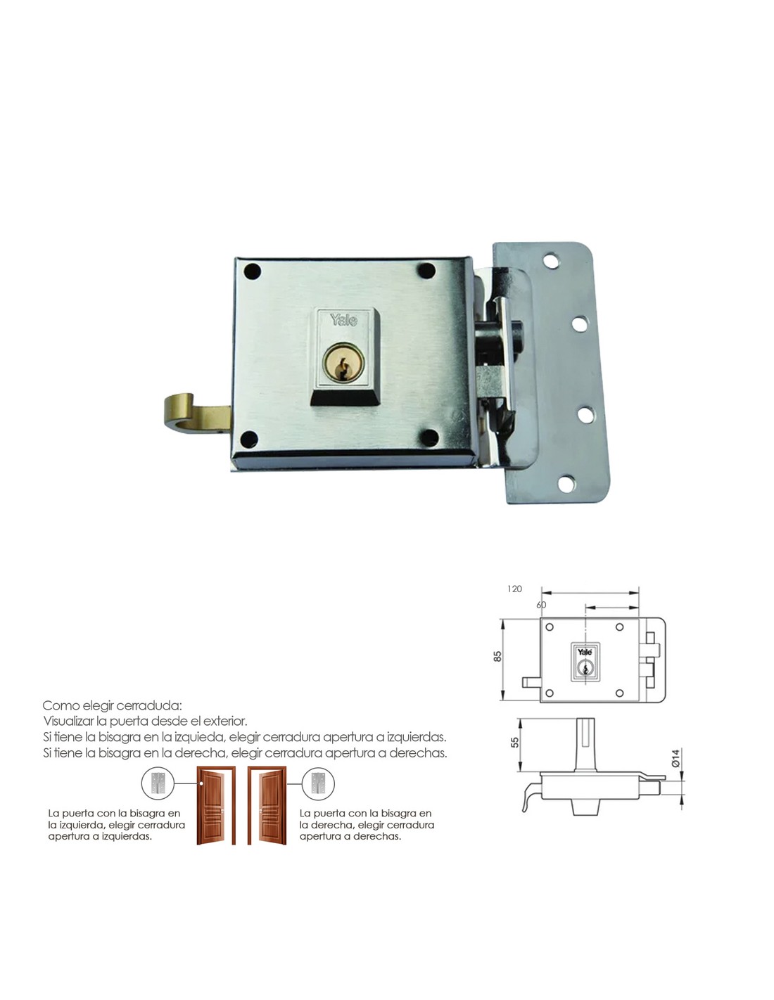 Cerradura Yale / Azbe 6-12-hn. - Cerradura de sobreponer con sistema antipalanca. - Cilindro exterior forjado. - Doble cilindro. - Picaporte con tirador y palanca. - Sentido de apertura: derecha. - Acabado en Niquel