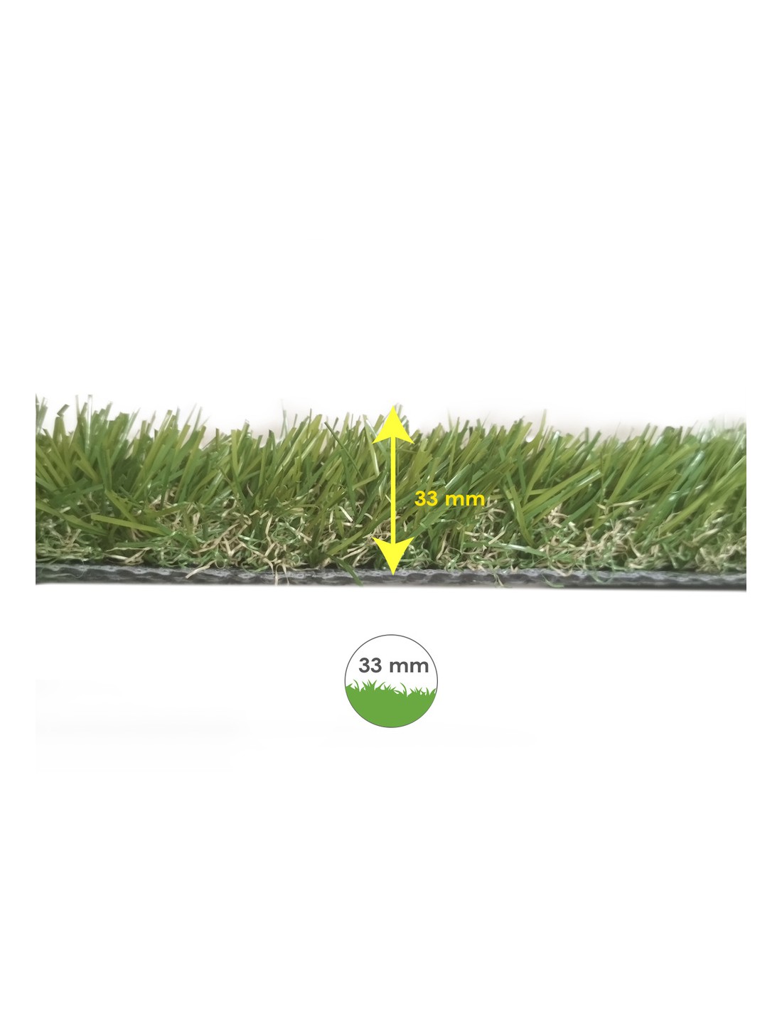 - Césped artificial de alta densidad con una altura de 33 mm.