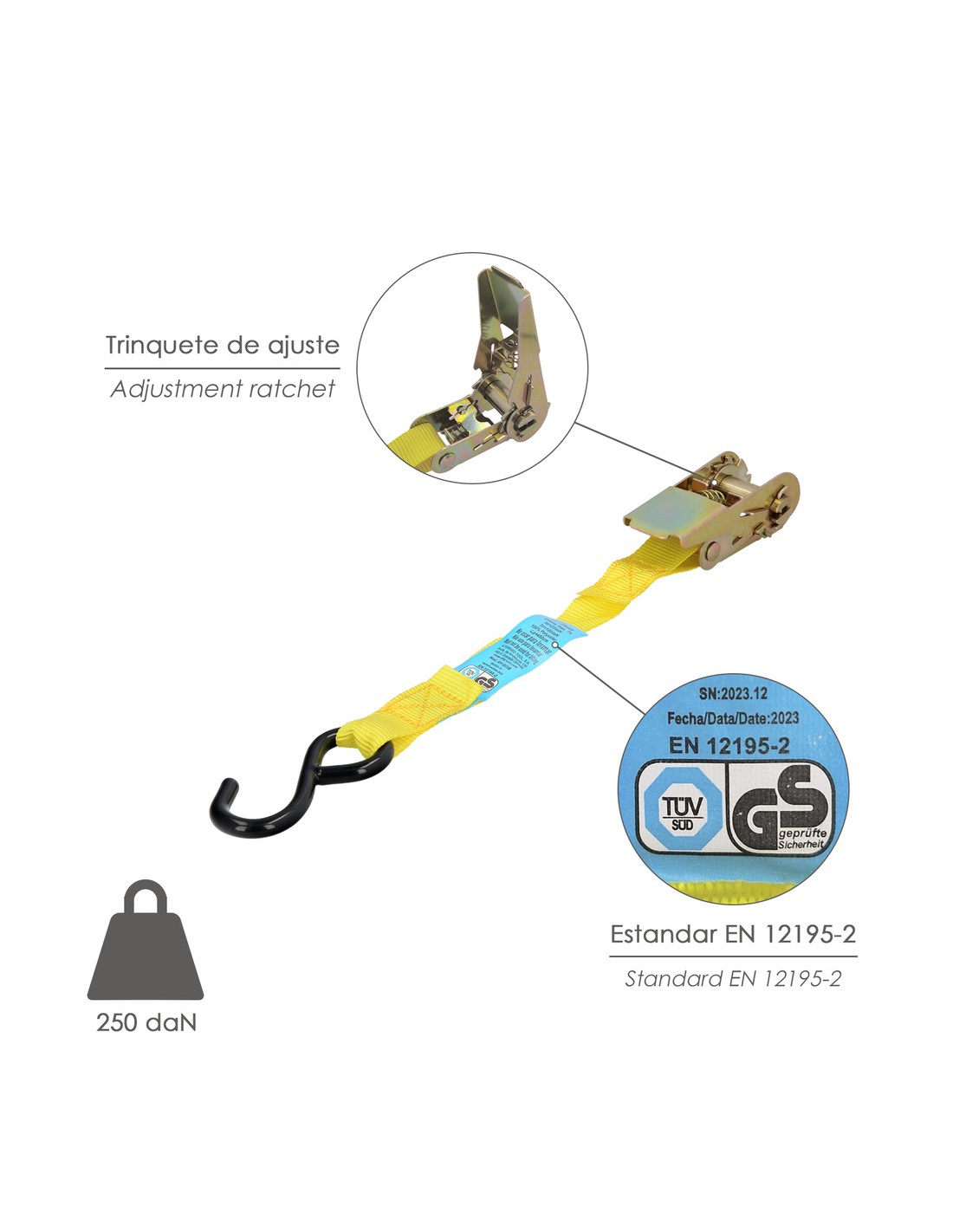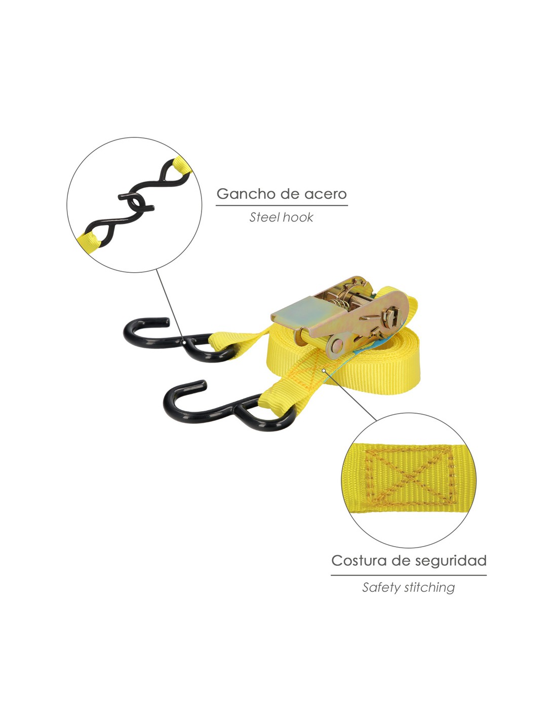 - Artículo también conocido como cincha, eslinga, amarradera, cinta de amarre, trinquete de amarre.