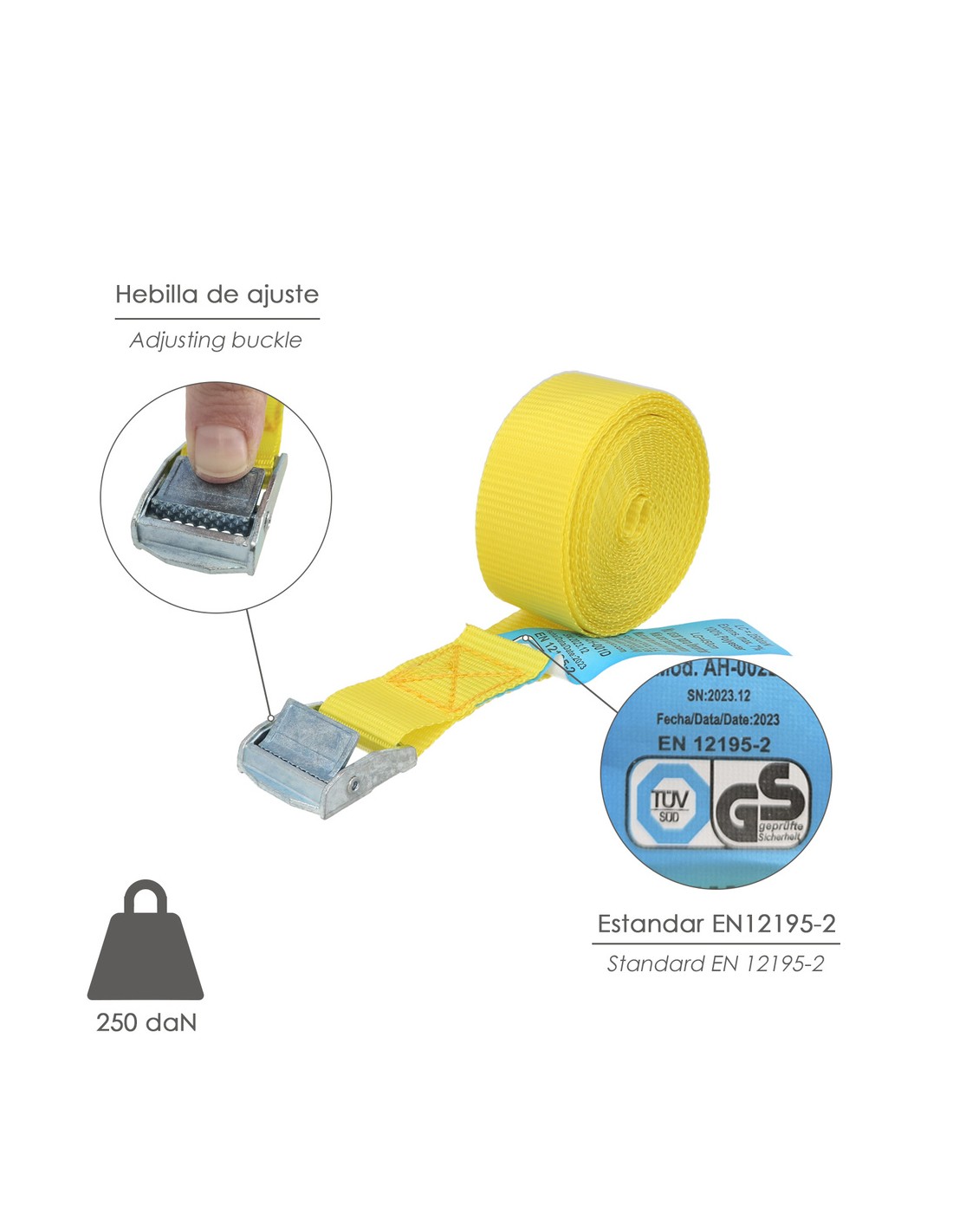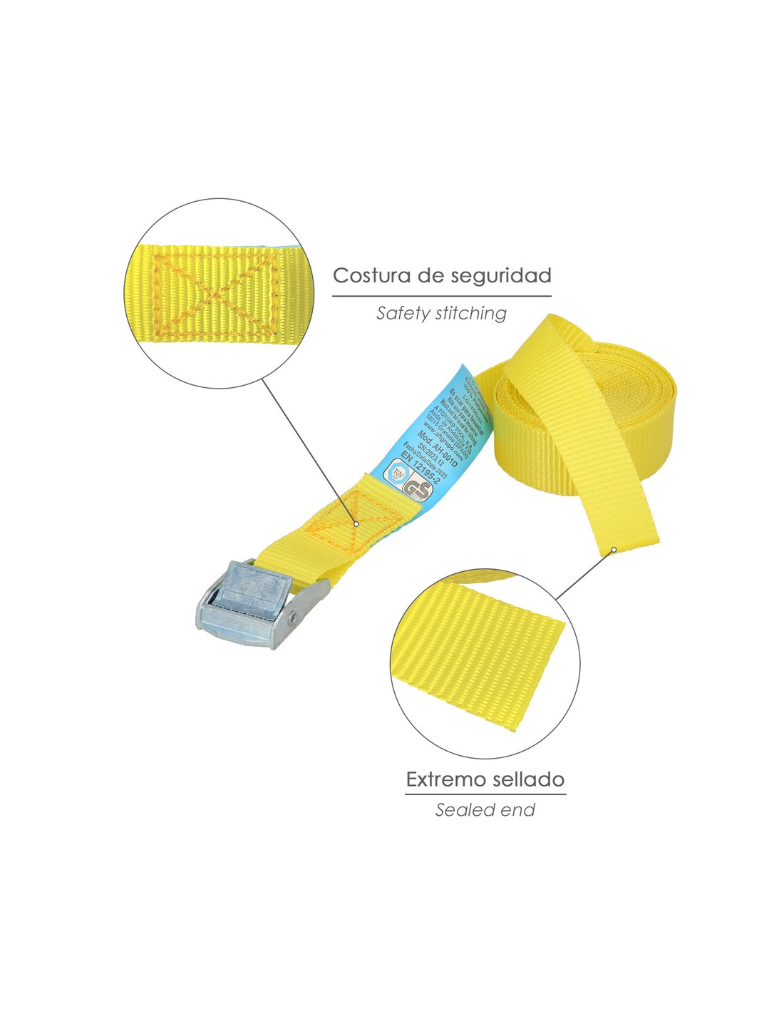 - Artículo también conocido como cincha, eslinga, amarradera, cinta de amarre, trinquete de amarre.