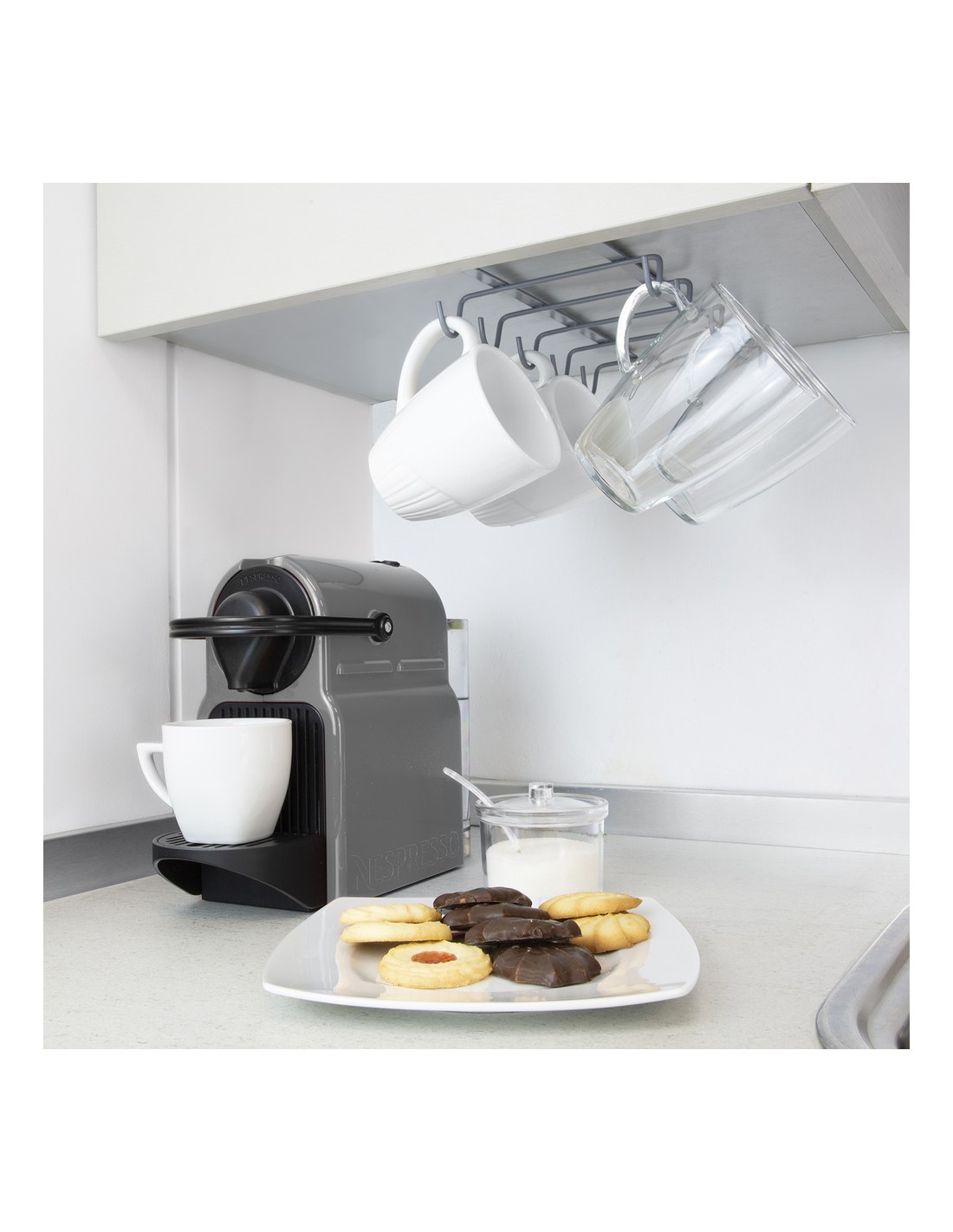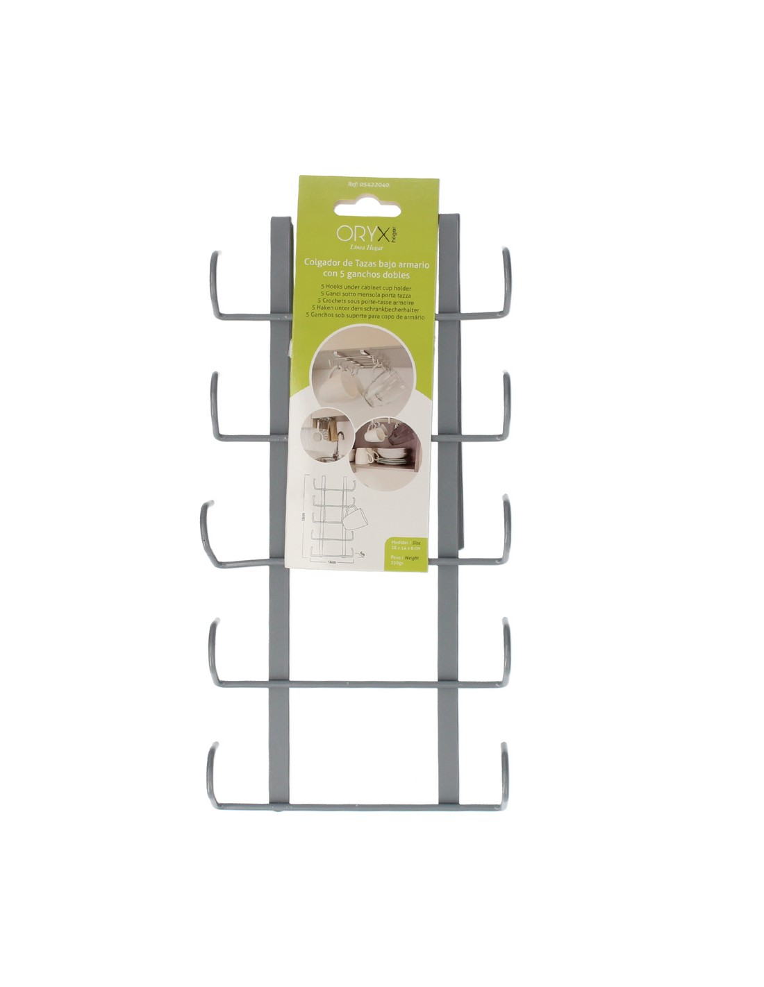 - Puede usarse como 5 ganchos dobles o 10 individuales, logrando un capacidad para 10 tazas.