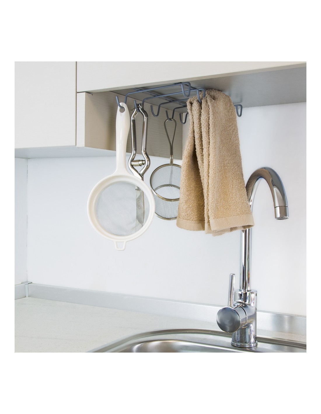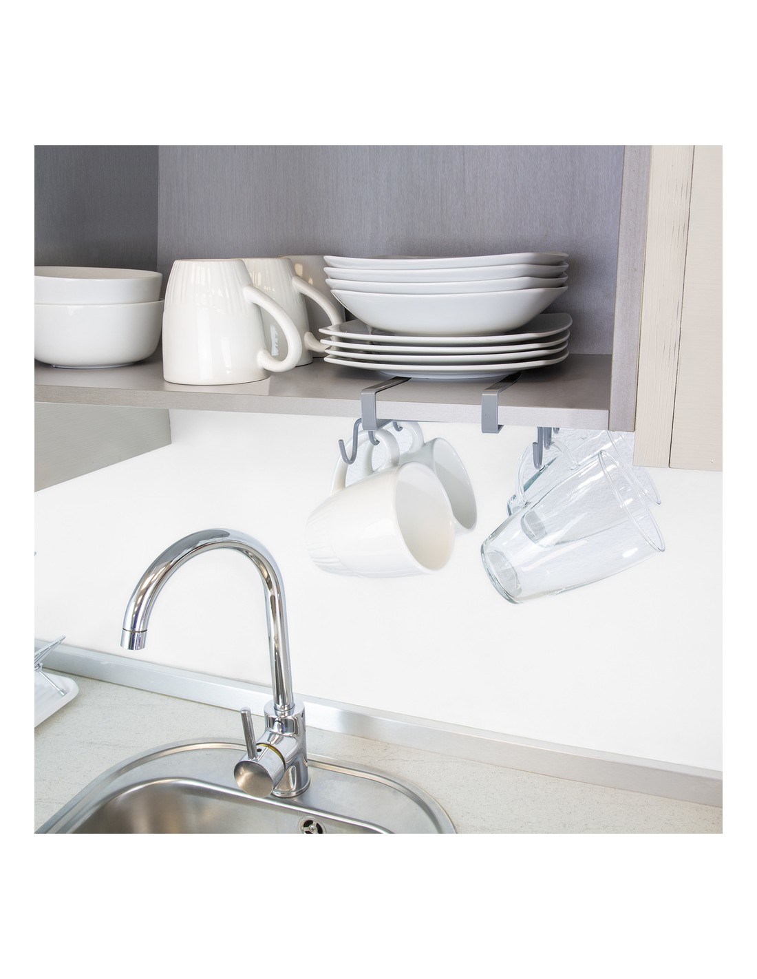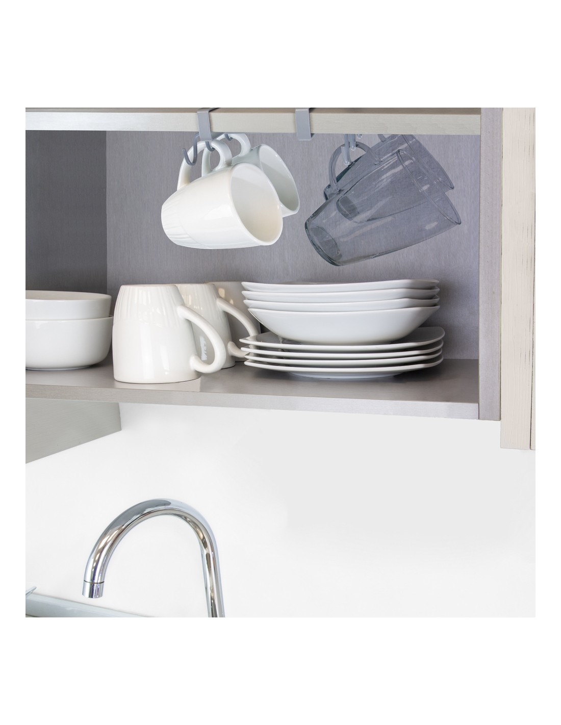 - Colgador para tazas o menaje de cocina, que puede colocarse bajo baldas o armarios de cocina, y permite organizar de forma práctica su menaje.