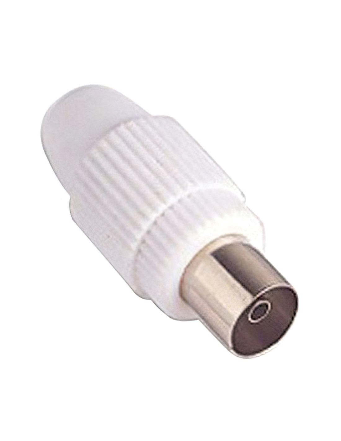 Conector tv hembra recto. - Medida: 9,5 mm. - Ideal para trabajos de electrónica. - Color blanco. - Articulo conocido como conector cable de antena, cable television, cable coaxial.