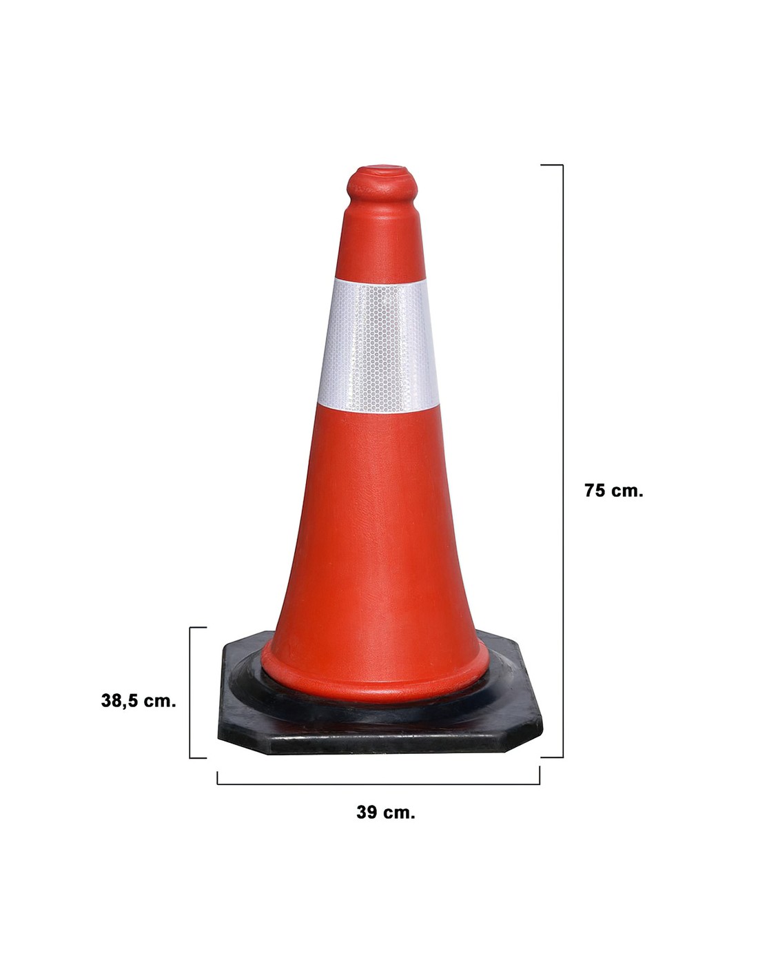 Cono Señalizacion Base Goma. - Medida: 75 cm. - Con banda reflectante. - Base goma para mayor estabilidad. - Articulo tambien conocido como cono obras, cono parking, cono carretera, cono seguridad.