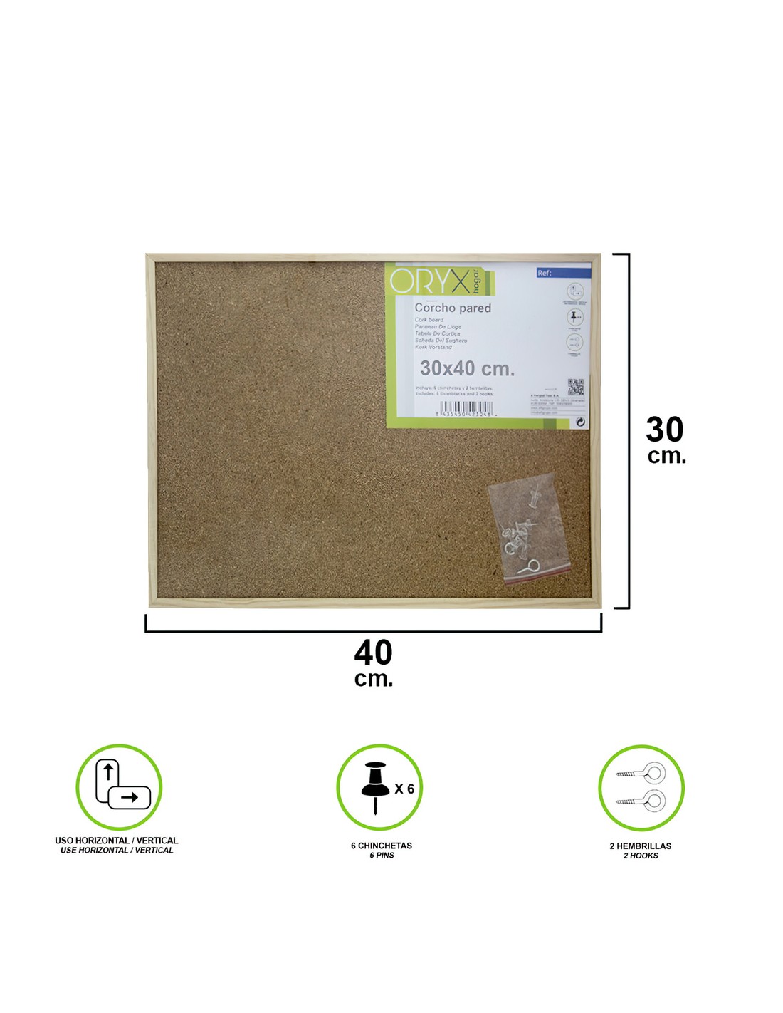 Tablero de Corcho Pared - Medida: 30x40 cm. - Con 6 chinchetas. - Con bordes realizados en madera. - Con alcayatas para su instalación. - Articulo también conocido como corcho organizador, corcho anuncios, corcho oficina.