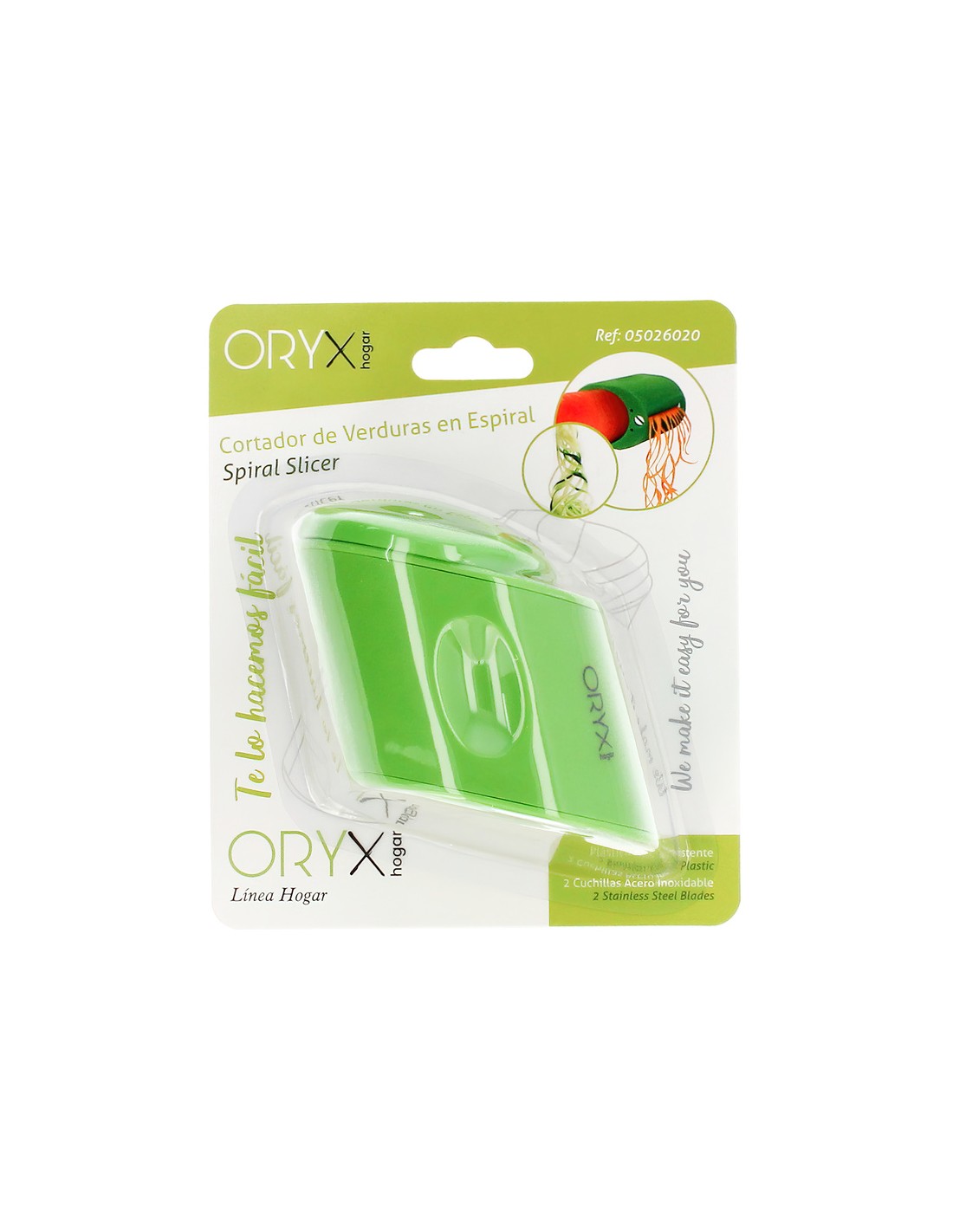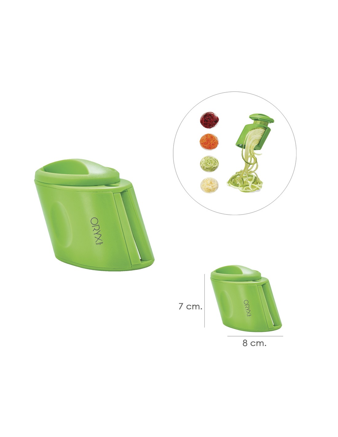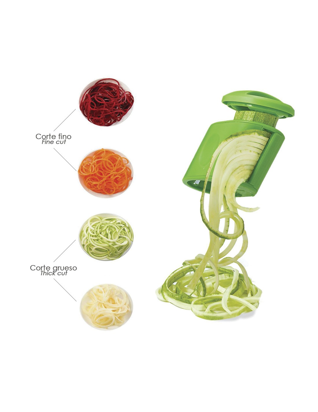 - Cortador de verduras con doble cuchilla, para corte fino o grueso, en forma de espiral.