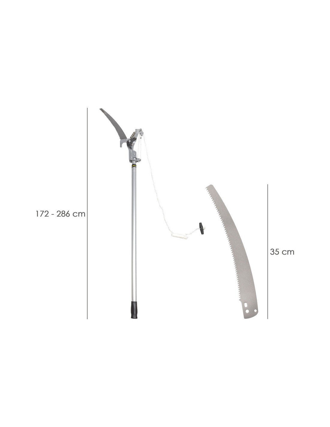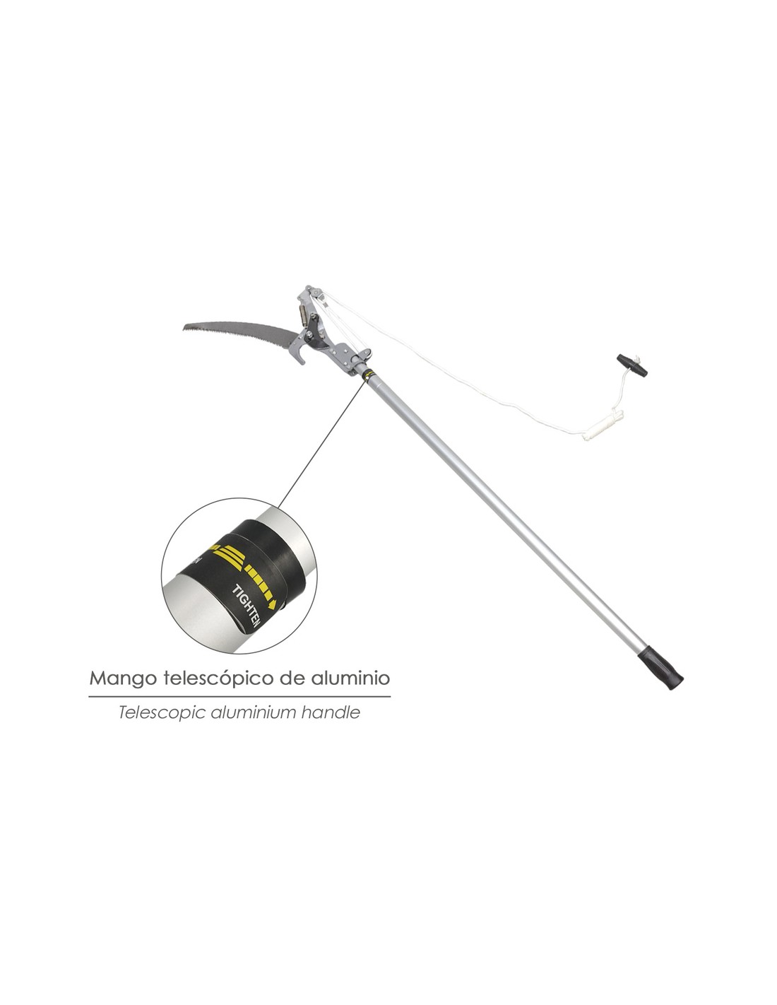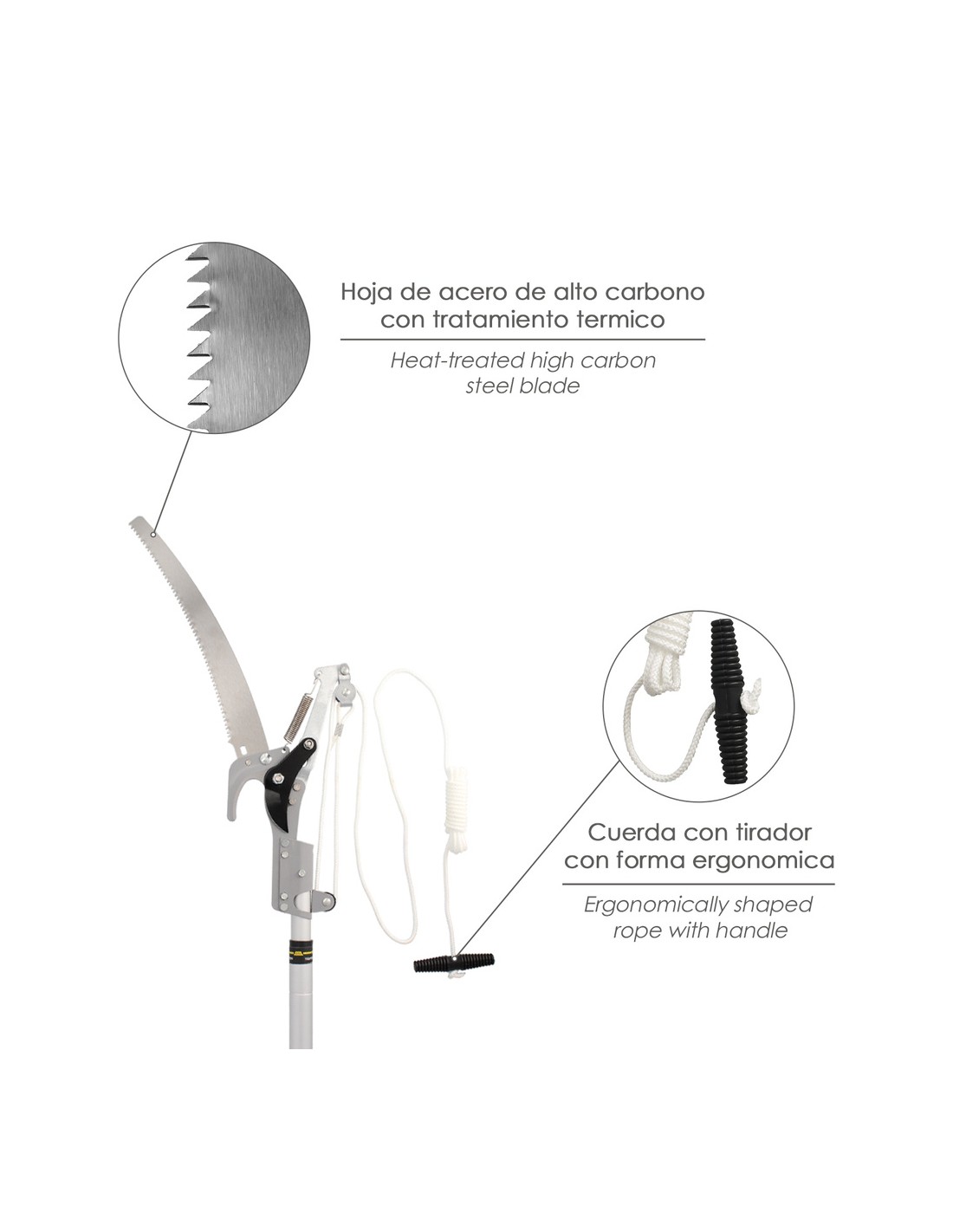 - Cuerda con tirador con forma ergonomica, para transferir toda la tracción al corta ramas.