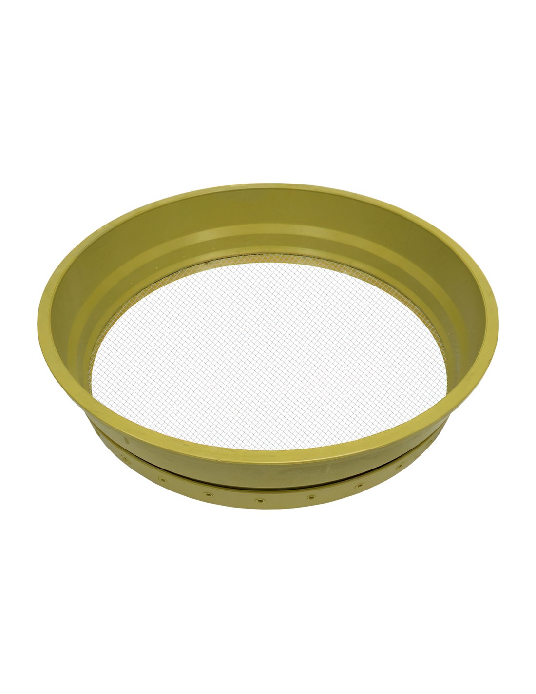 Criba completa. - Diámetro: 450 mm. - Altura: 100 mm. - Agujero 12 (1.85 mm.). - Cuerpo realizado en plastico resistente. - Nervio superior del aro reforzado. - Malla de acero galvanizado. - Articulo tambien conocido como cernedero, tamiz, cedazo, harnero.
