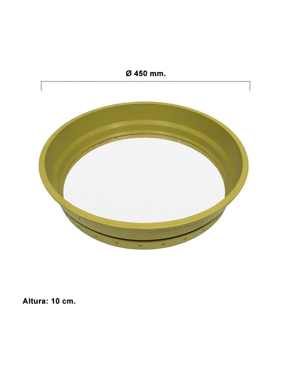 Criba completa. - Diámetro: 450 mm. - Altura: 100 mm. - Agujero 14 (1.6 mm.). - Cuerpo realizado en plastico resistente. - Nervio superior del aro reforzado. - Malla de acero galvanizado. - Articulo tambien conocido como cernedero, tamiz, cedazo, harnero.