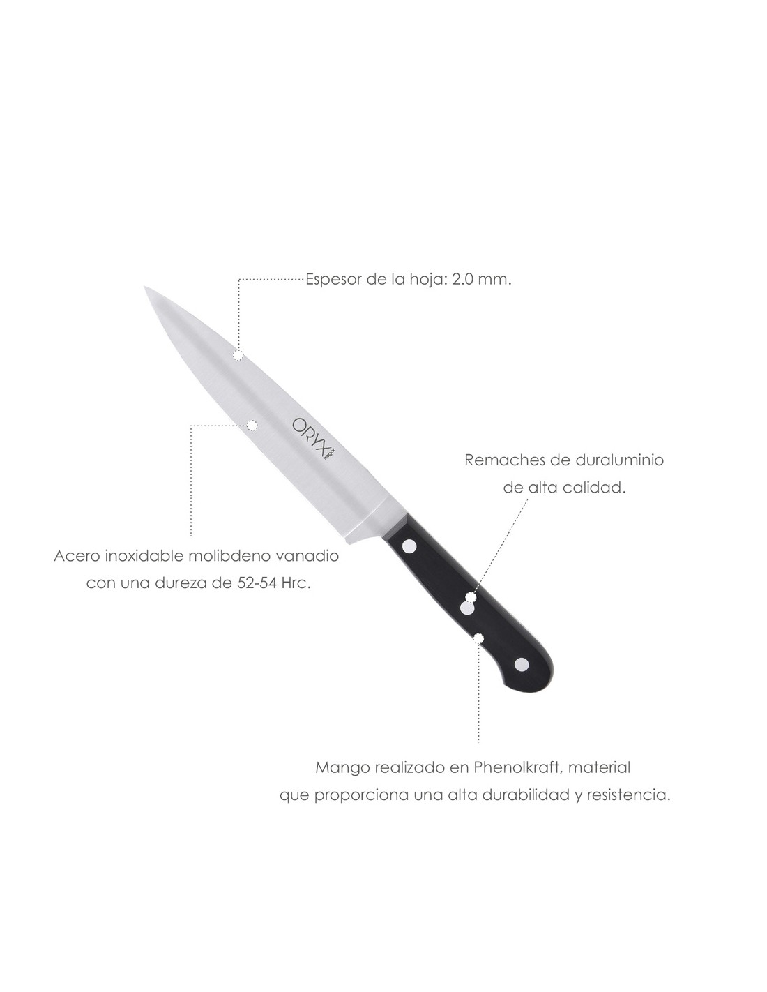 - Hoja realizada en acero inoxidable molibdeno vanadio con una dureza de 52-54 hrc.