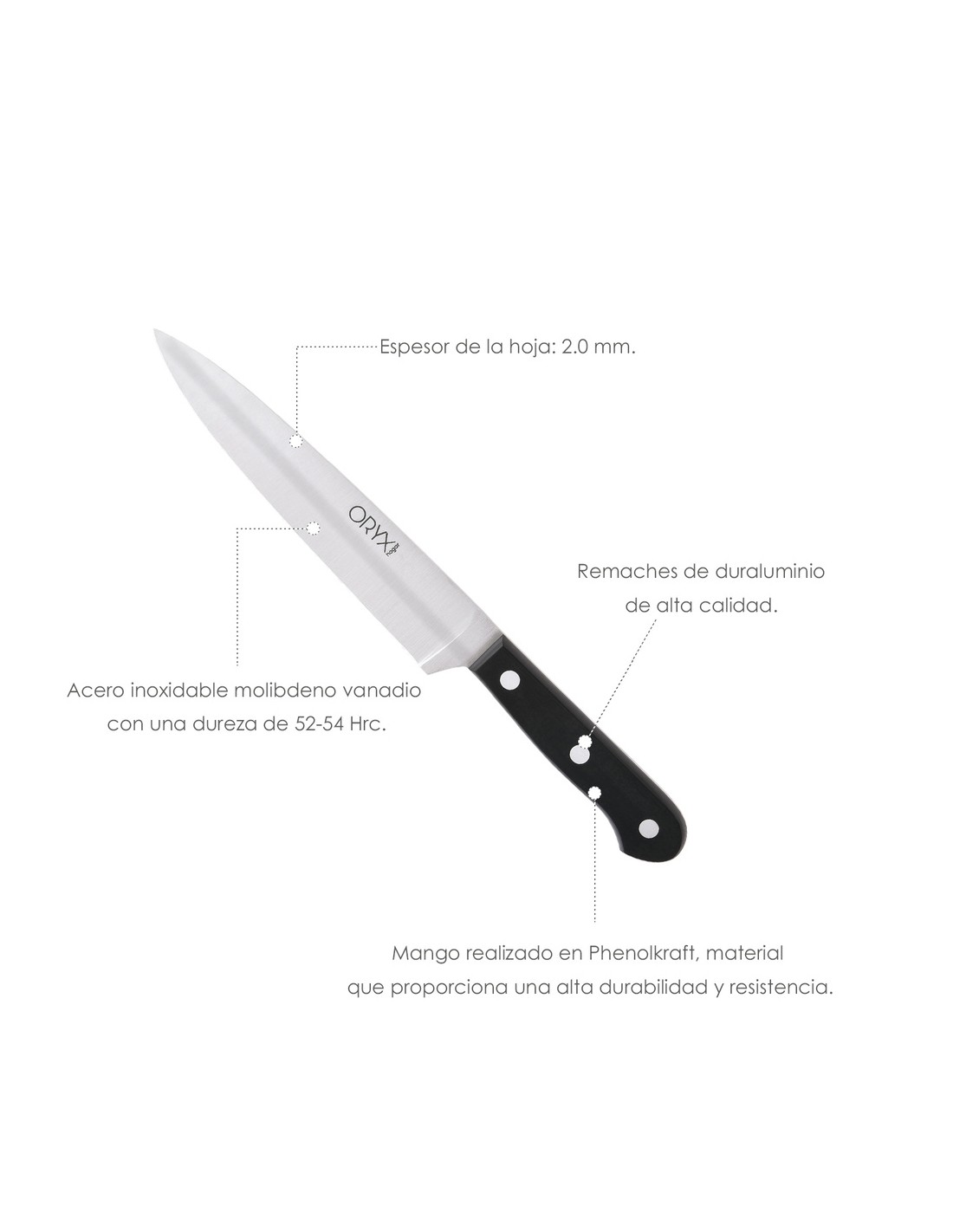 - Hoja realizada en acero inoxidable molibdeno vanadio con una dureza de 52-54 hrc.