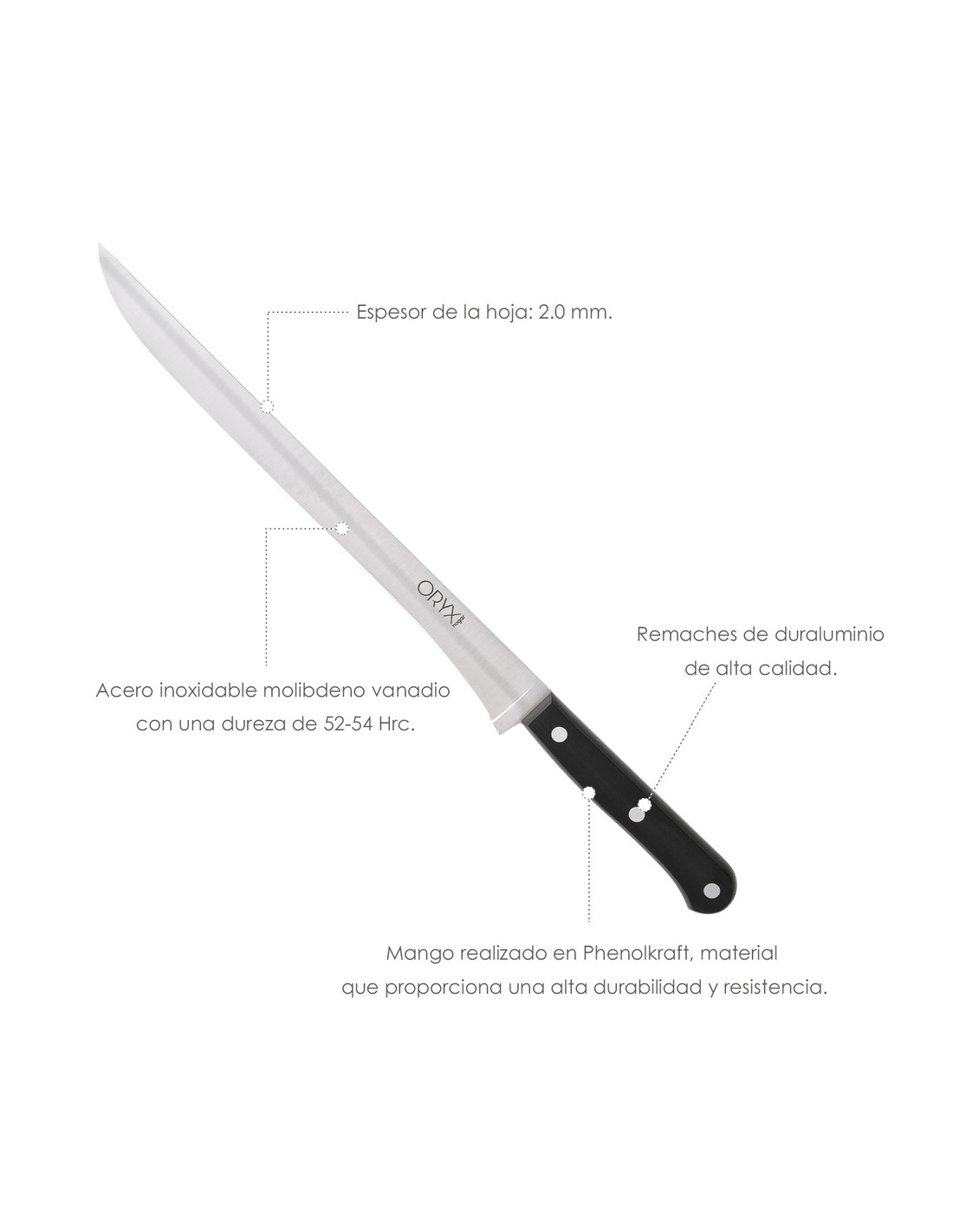 - Hoja realizada en acero inoxidable molibdeno vanadio con una dureza de 52-54 hrc.
