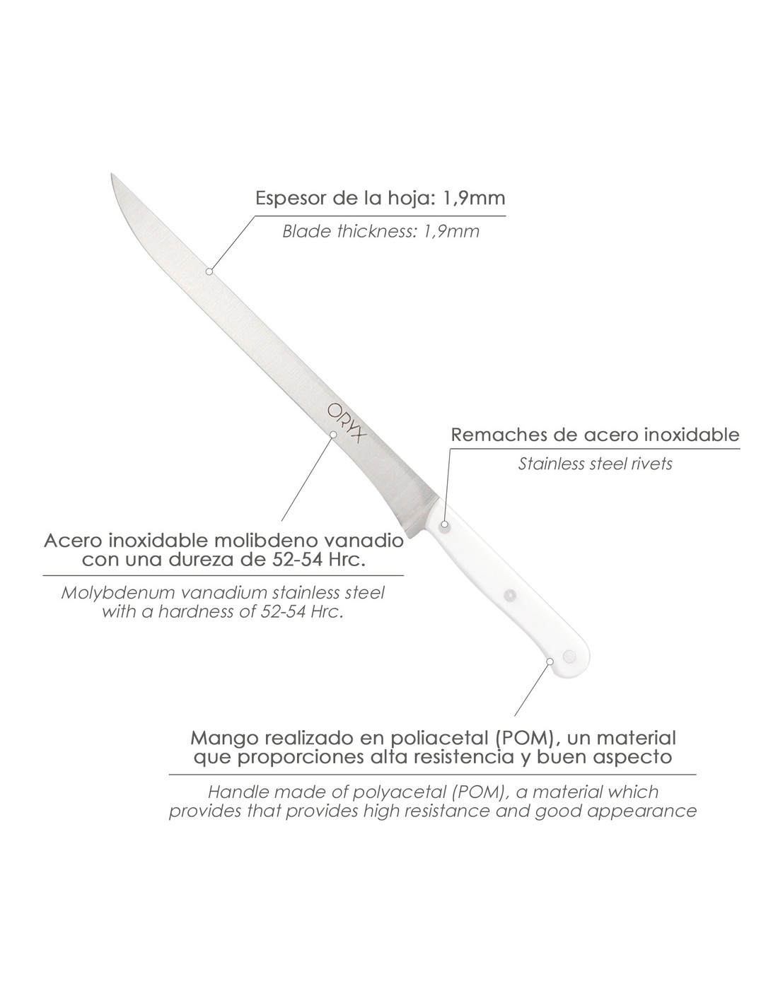 - Hoja realizada en acero inoxidable molibdeno vanadio con una dureza de 52-54 hrc.