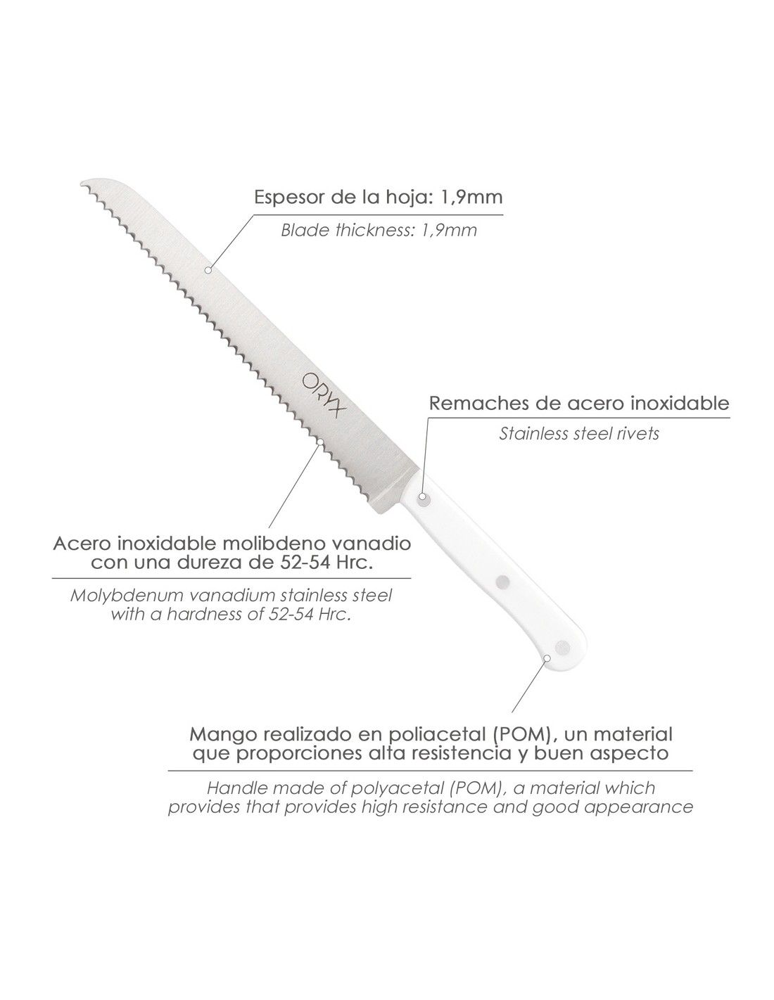 - Hoja realizada en acero inoxidable molibdeno vanadio con una dureza de 52-54 hrc.