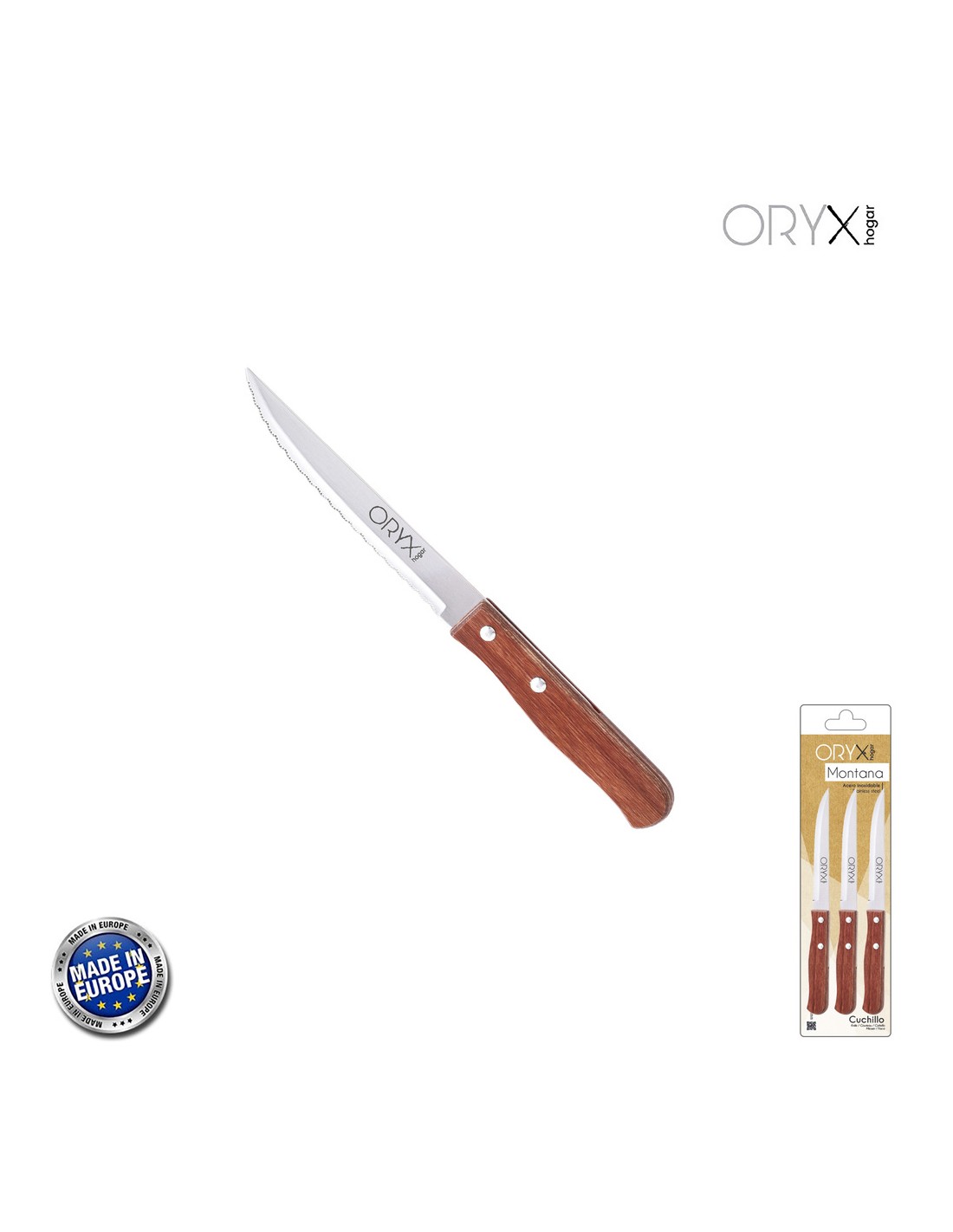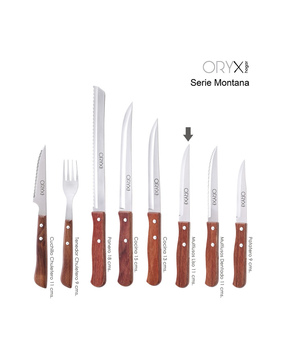 - La serie Montana se define por su parecido con maderas naturales, fabricados en acero inoxidable, de hoja estrecha y mango de madera prensada, se trata de un diseño clasico, funcional y resistente, caracteristicas que hacen que su duración sea larga, incluso con usos frecuentes.