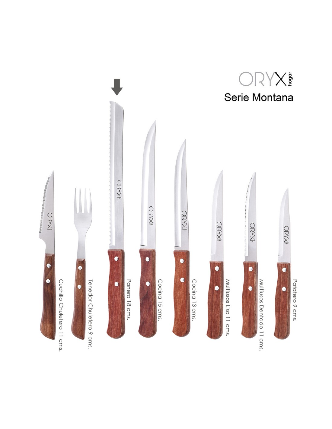 - La serie Montana se define por su parecido con maderas naturales, fabricados en acero inoxidable, de hoja estrecha y mango de madera prensada, se trata de un diseño clasico, funcional y resistente, caracteristicas que hacen que su duración sea larga, incluso con usos frecuentes.