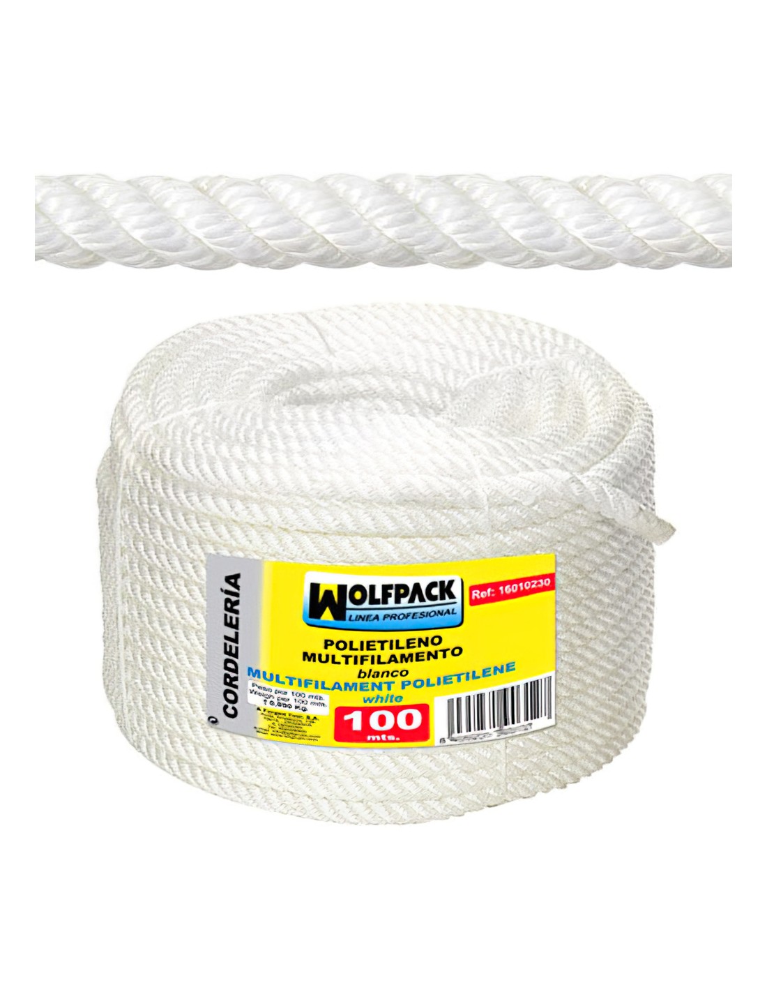 Cuerda / soga polipropileno multifibra. -ESTRICTAMENTE PARA USO DOMESTICO. NO SE DEBE USAR NI PARA ELEVACION DE NINGÚN TIPO DE CARGA O PERSONAS NI PARA ARRASTRE NI SUJECCION DE CARGA ALGUNA. - Rollo: 100 metros. - Diámetro: 6 mm.