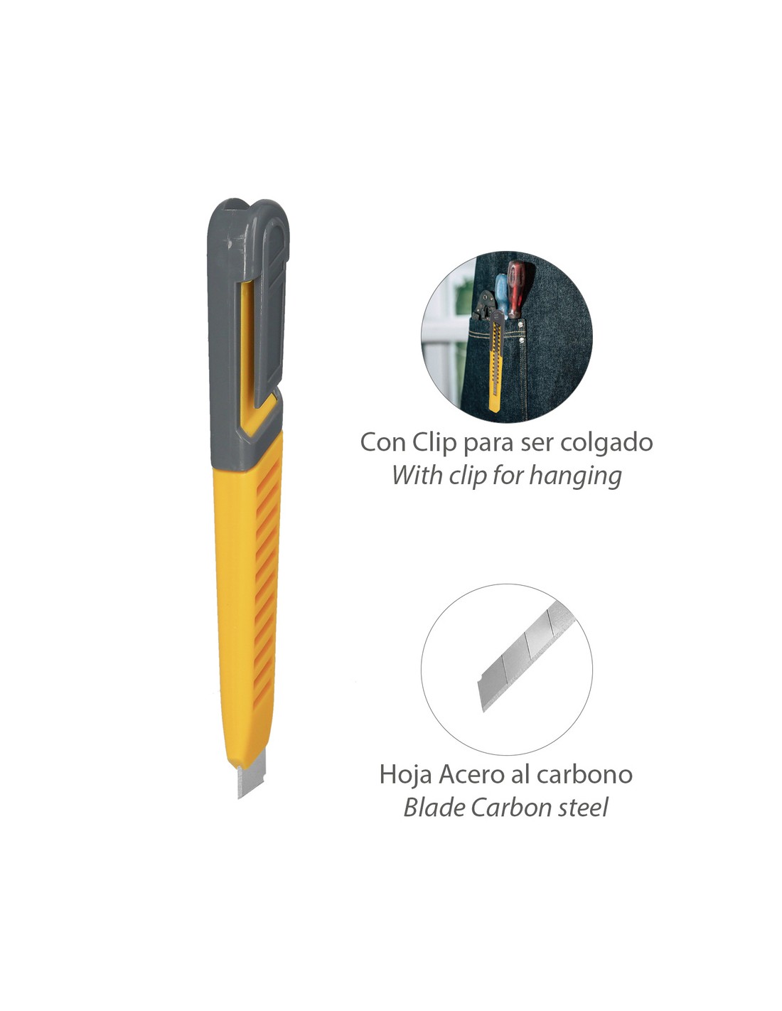 - Con clip de sujeción, puede llevar el cutter tanto por dentro del bolsillo como por fuera.