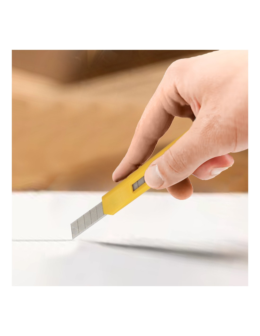- Ideal para: corte de papel, cartulinas, manualidades, apertura de paquetes o cajas de cartón, corte de alfombras y tapicería, corte de vinilos desembalaje de productos, etc.