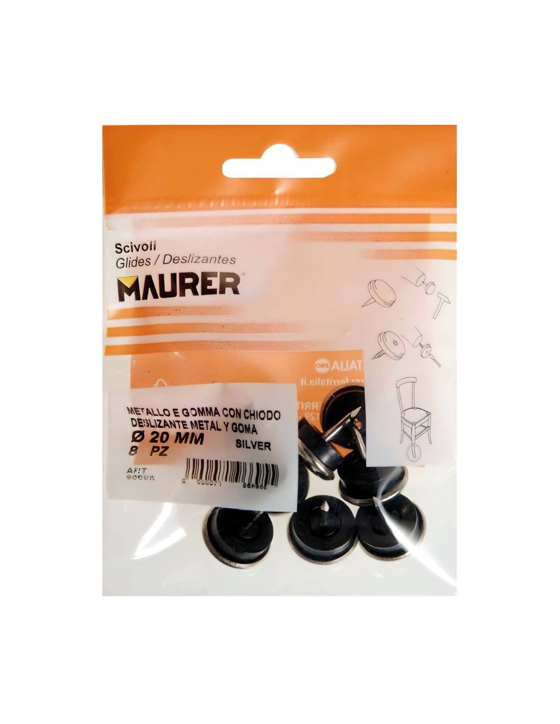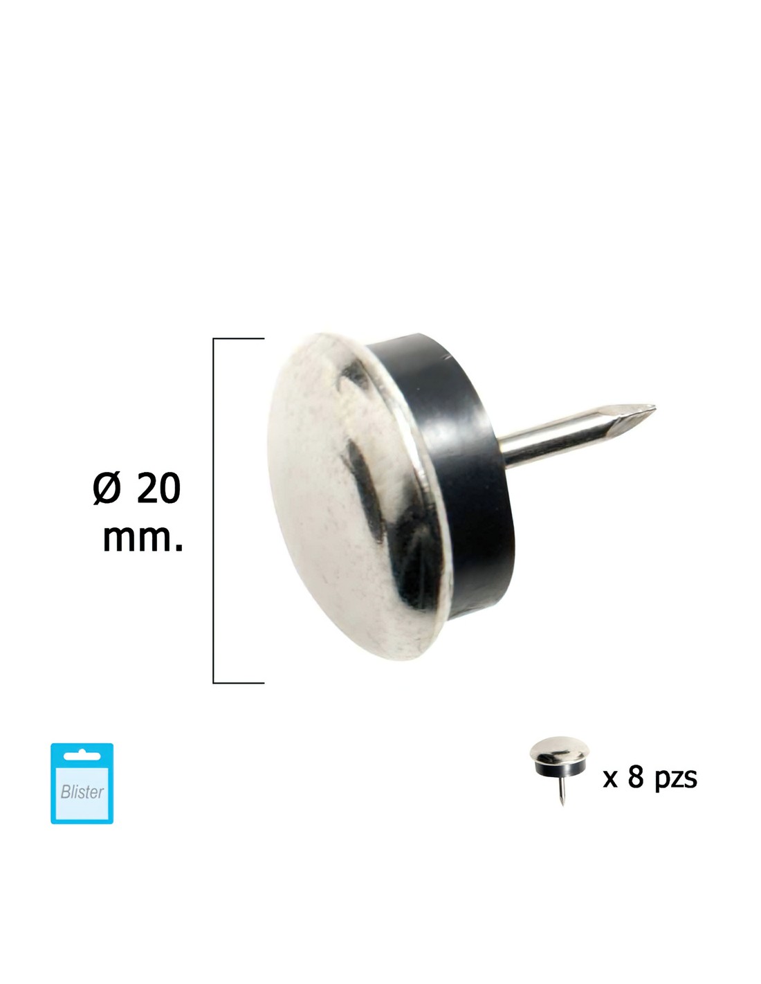 Deslizante metal goma claro. - Diametro: 20 mm. - Blister 8 unidades. - Realizado en metal y goma. - Articulo conocido como: deslizantes, deslizantes goma, protectores suelo, deslizantes sillas.