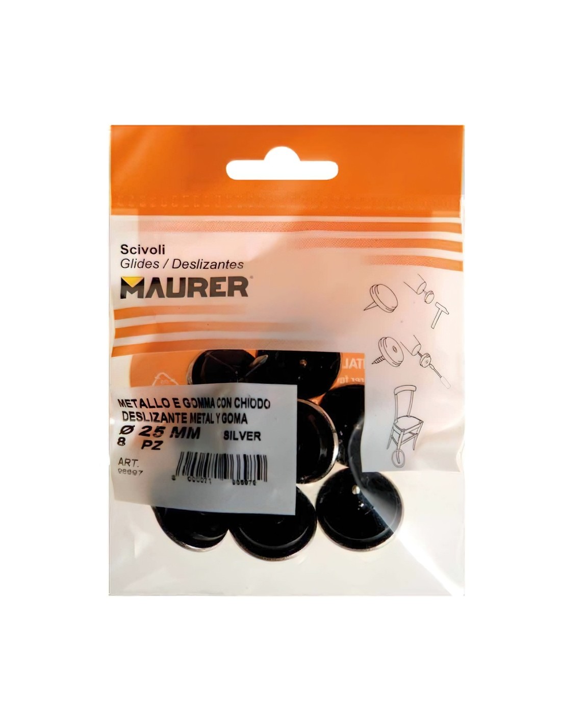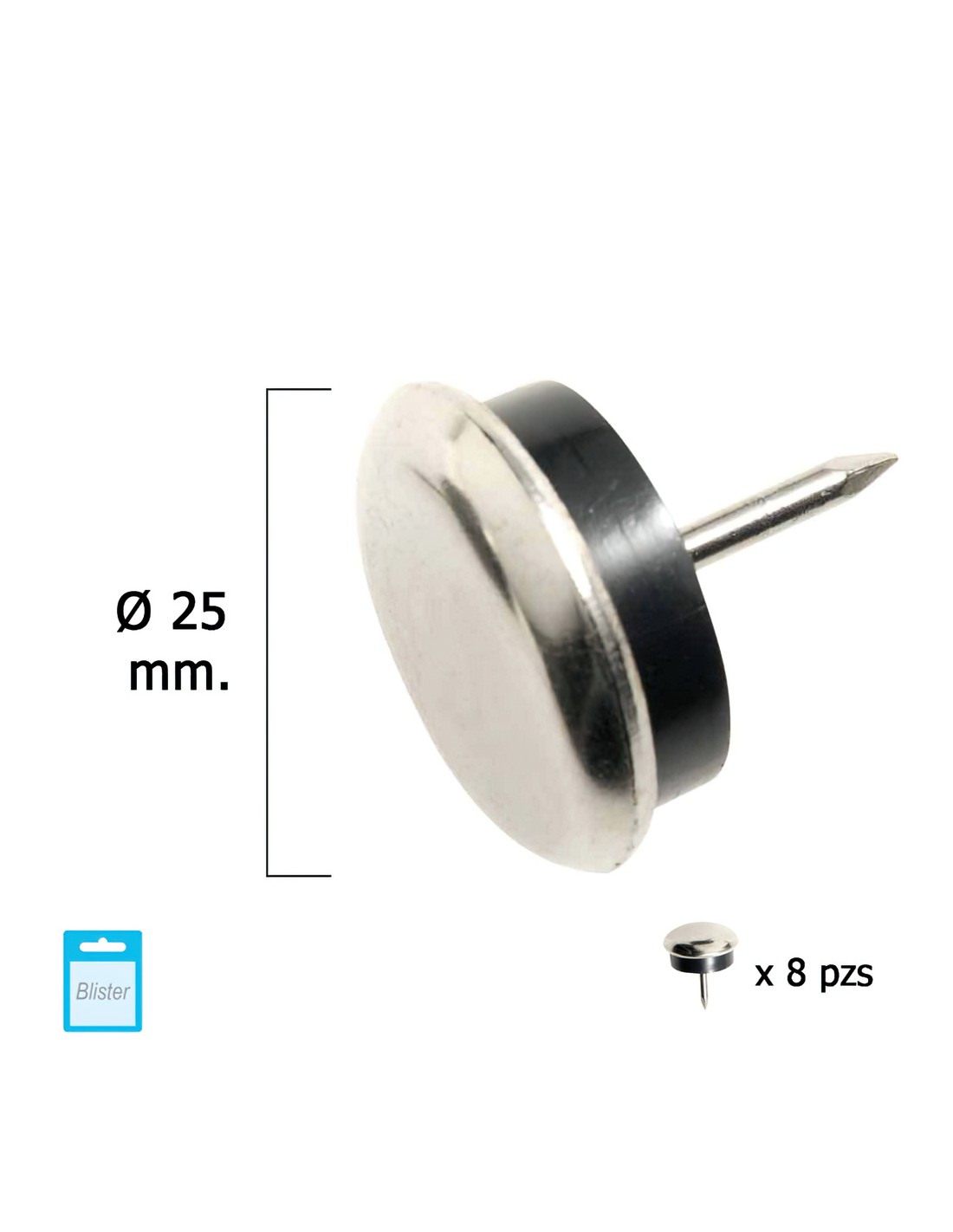 Deslizante metal goma claro. - Diametro: 25 mm. - Blister 8 unidades. - Realizado en metal y goma. - Articulo conocido como: deslizantes, deslizantes goma, protectores suelo, deslizantes sillas.