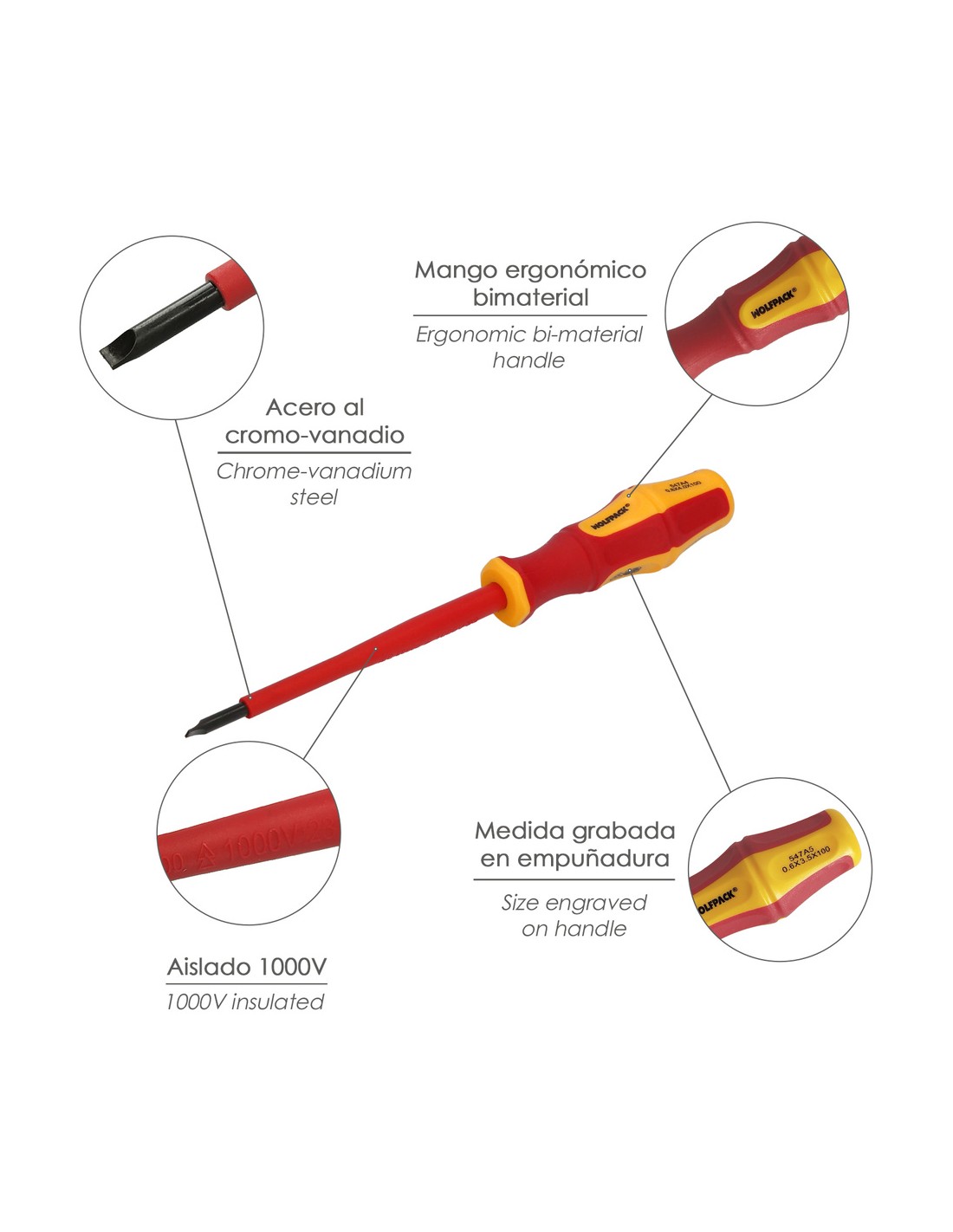 Destornillador Plano Aislado Certificado VDE 1.000 V. Medida 0,6x Ø 3,0 x 100 mm. Destornillador Seguridad Electricista